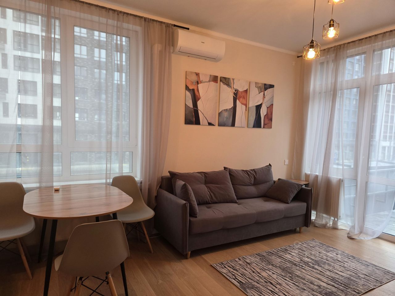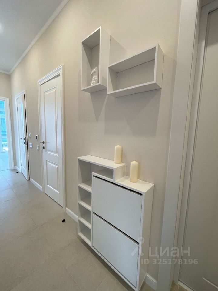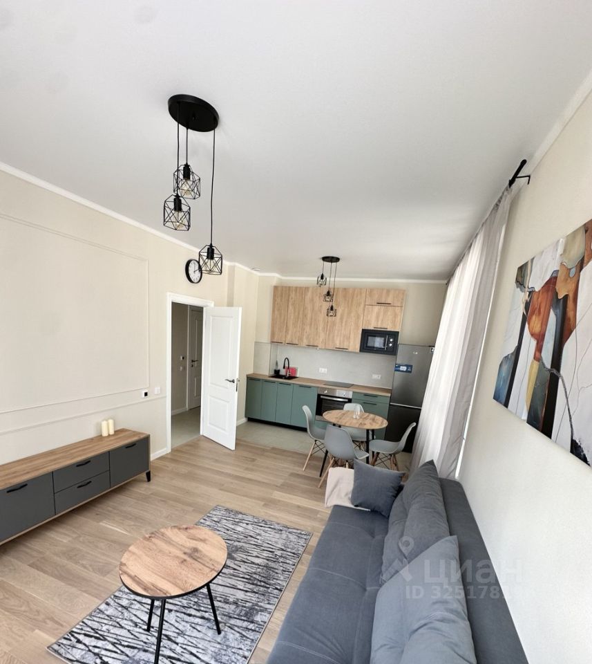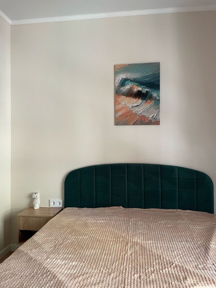 Квартира укомплектована всем необходимым: мебель и техника: двуспальная кровать с прикроватными тумбами, кухонный гарнитур со встроенной техникой (посудомоечная машина, духовой шкаф, микроволновая печь), варочная панель, холодильник, кондиционер и стиральная машина, стол с 4-мя стульями, диван, тумба под телевизор, кондиционер.