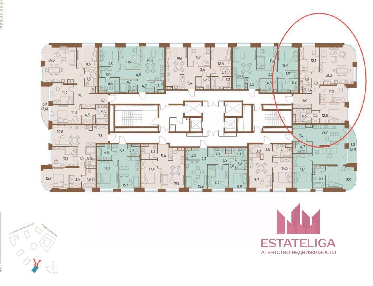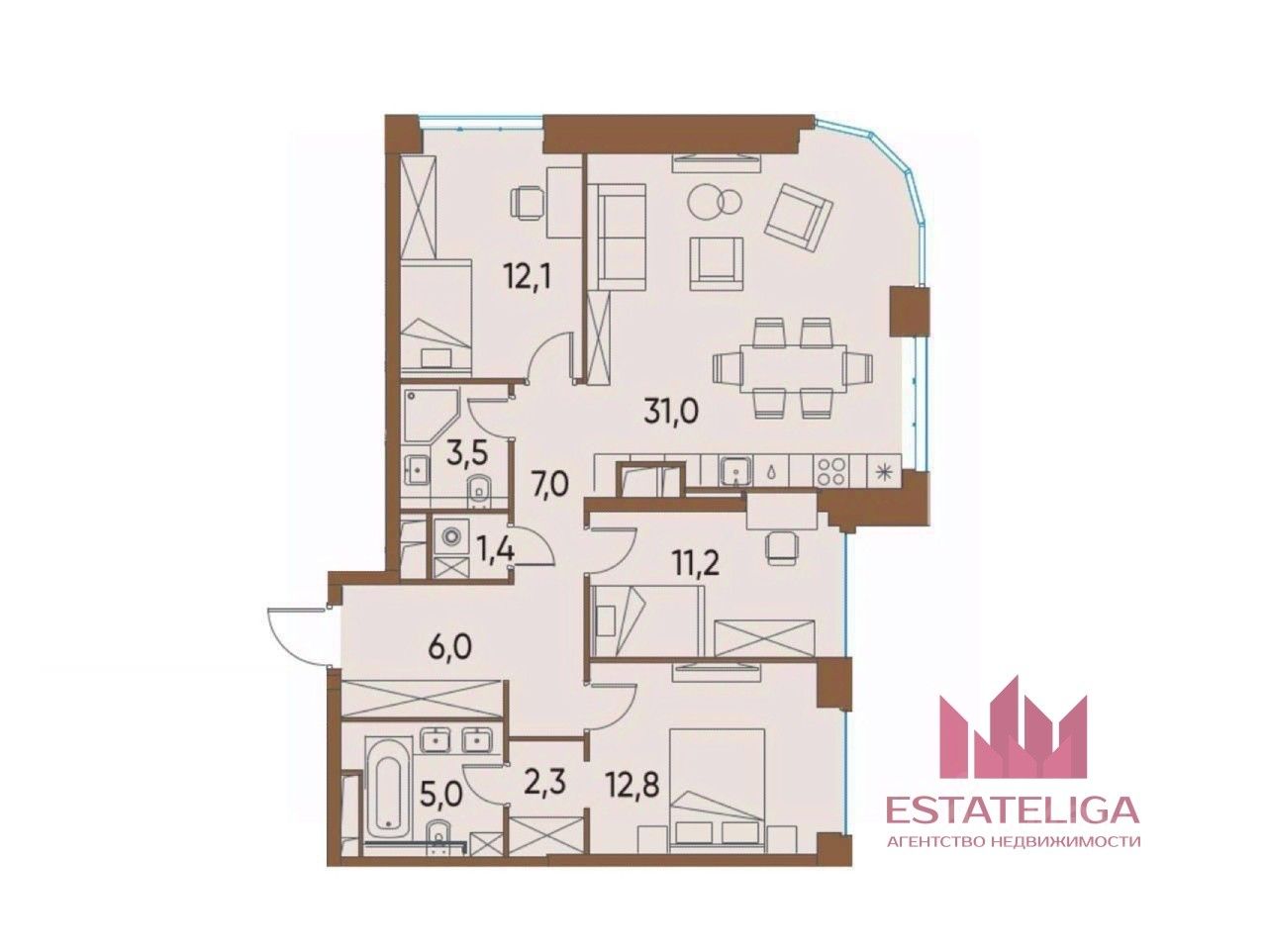 Просторная квартира с 3 спальнями, 2 санузлами и гостинной 31 метр.