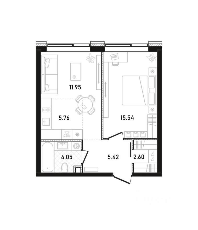 В жилом комплексе Republic предлагается двухкомнатная квартира без отделки. Планировка: кухня-гостиная, спальня, ванная комната, зона гардеробной. Окна ориентированы в одну сторону.
