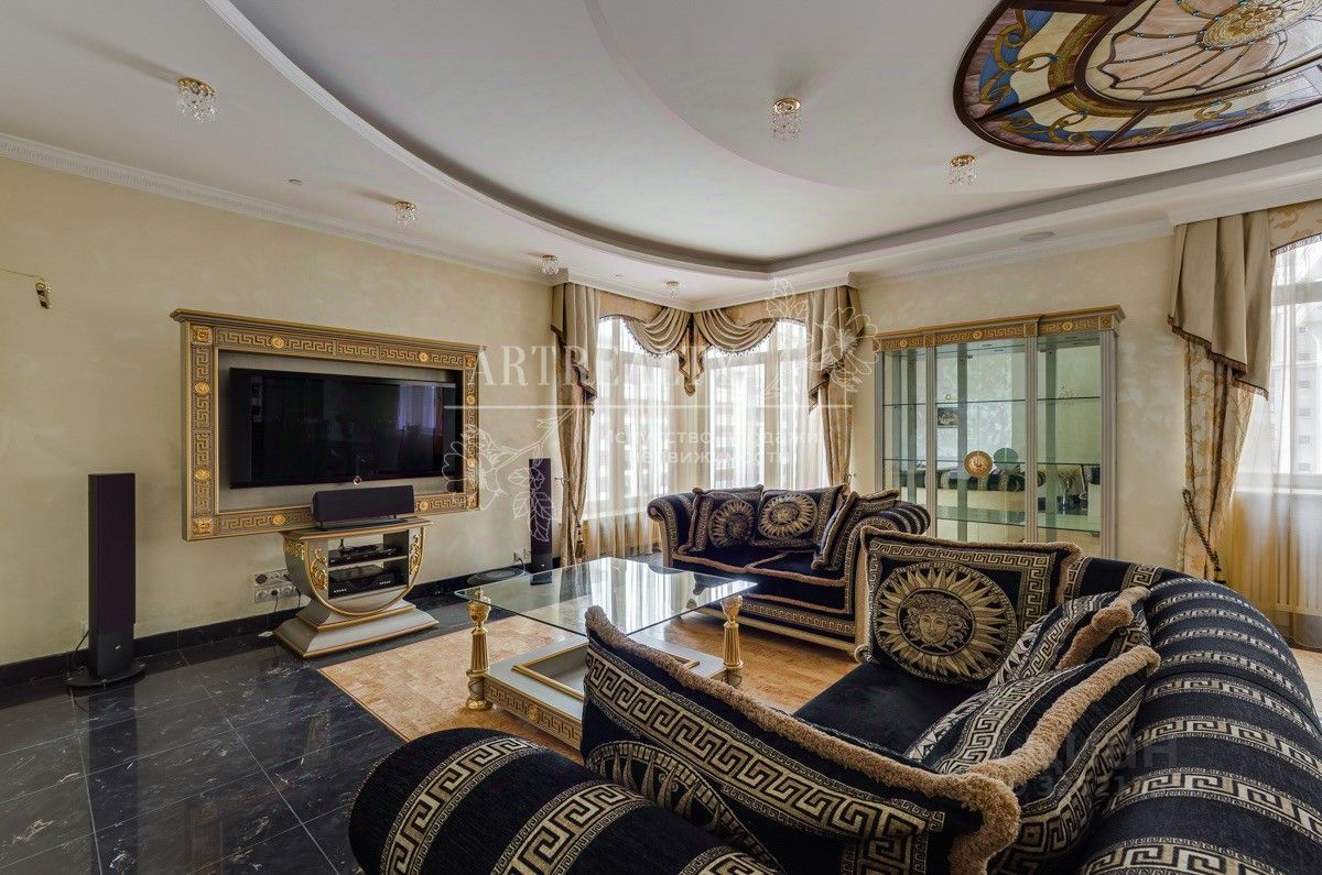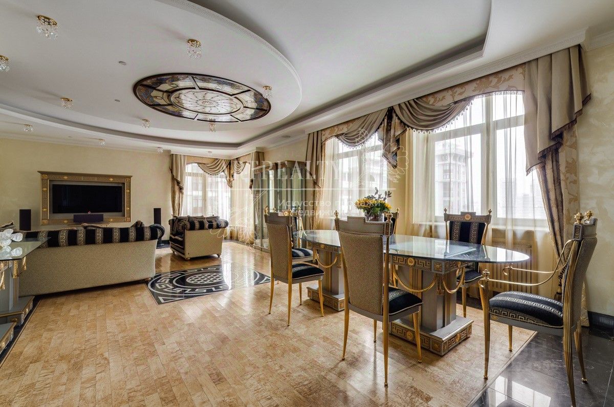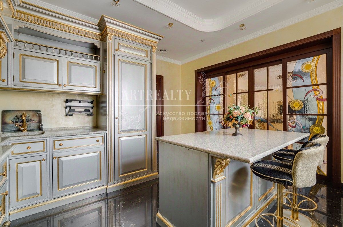 Шикарная квартира функционально разделена на 2 зоны: гостевой блок включает: гостиную с панорамными окнами, камин, кухню (мебель, вся бытовая техника, включая подогреватель для посуды и винный шкаф), столовую зону, гостевой санузел и постирочная комната. Спальный блок: кабинет, выполненный по индивидуальному проекту авторской мастерской (может использоваться как гостевая комната) и две изолированные спальни, гардеробная, большой санузел с гидромассажной ванной, гардеробная комната. Ремонт выполнен с использованием высококачественных материалов.