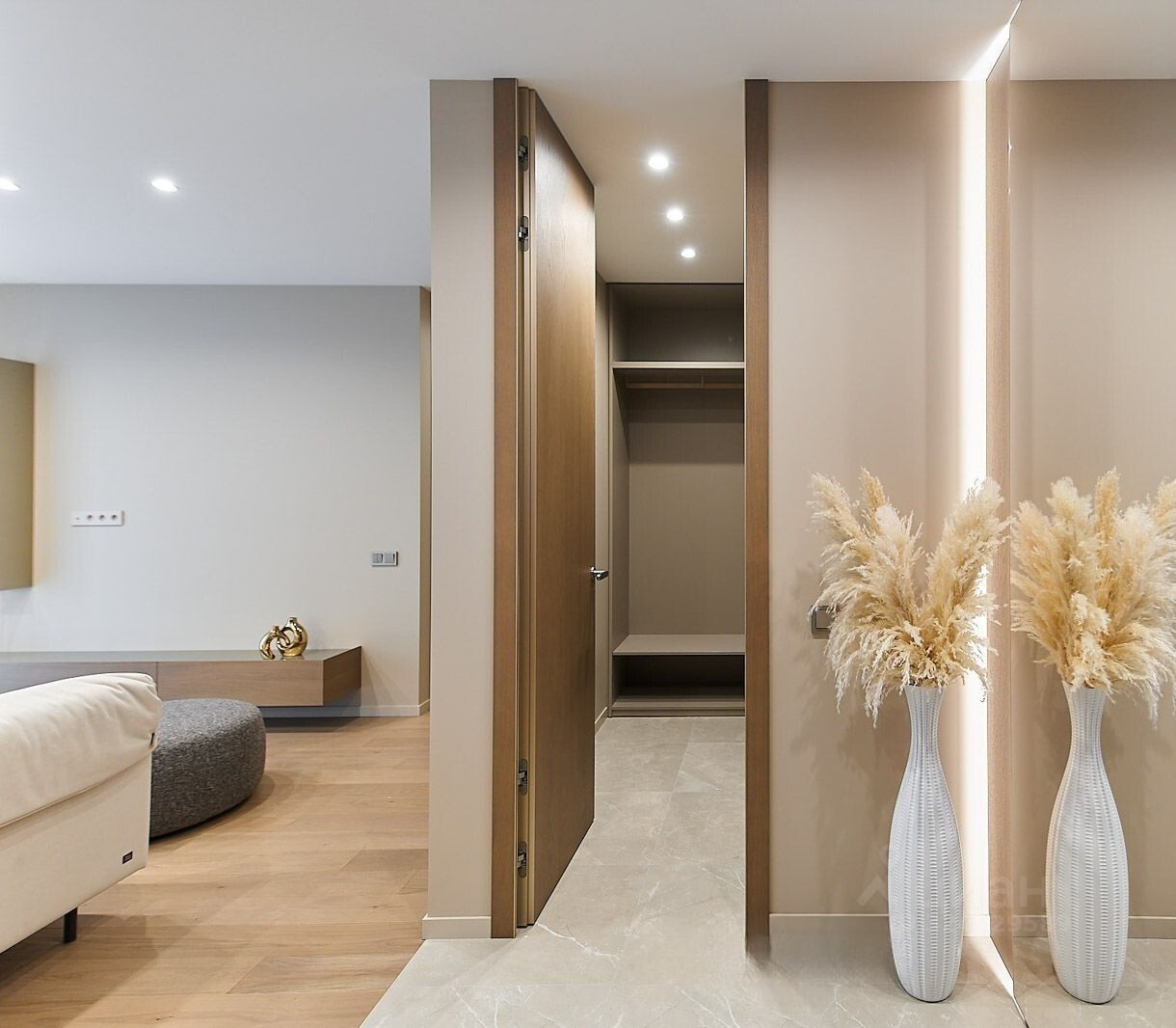 Мебель изготовлена по индивидуальному проекту компанией Domani из шпона дуба + керамогранит Inalco (премиум Испания). Двери изготовлены компанией Lazio. Паркет на полу. В сан/узле + пол керамогранит, фуга эпоксидная, сантехника встроенная, инсталляция TECE (Германия), встроенный трап в плитку.