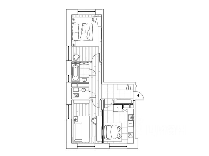 Планировкой предусмотрены: • просторная кухня с кухонным столом, встроенной кухонной техникой (холодильник Whirlpool, варочная панель, духовой шкаф, посудомоечная машина) • спальня со встроенным шкафом и просторной двуспальной кроватью • отдельная гостиная (можно сделать вторую спальню или детскую!) • раздельный санузел • просторный холл со встроенным шкафом
