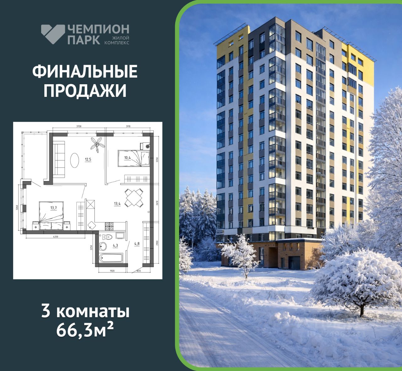 ФИНАЛЬНАЯ ПРОДАЖА КВАРТИР В ЖК ''ЧЕМПИОН ПАРК'' НАПРЯМУЮ ОТ ЗАСТРОЙЩИКА Просторная 3-комнатная ВИДОВАЯ квартира 66,3 м2 Окна выходят на БОР и на внутренний двор! ПОСЛЕДНЯЯ КВАРТИРА на 3ОМ ЭТАЖЕ ДОМА 2/1! — свободная планировка, — двойная ориентация окон (двор + бор) — баланс тишины и природы, — просторная квартира для большой семьи или ценителей комфорта. ДО КОНЦА ЯНВАРЯ ДЕЙСТВУЮТ АКЦИИ: ЗИМНЕЕ КОМБО - СКИДКА ДО 15% ПРИ ПОКУПКЕ КВАРТИРЫ ВМЕСТЕ С ПАРКОВКОЙ/КЛАДОВОЙ, БЕРЕМ ПЛАТЕЖИ ПО ИПОТЕКЕ НА СЕБЯ (НА СРОК ДО 12 МЕСЯЦЕВ), 2 ГОДА СЕРВИСА В ПОДАРОК И ДРУГИЕ ПРЕДЛОЖЕНИЯ! Болеe подpобную информацию менеджер предоставит по телефону! Звоните!