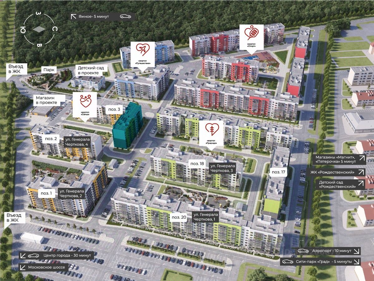 - Проектом предусмотрено 14 жилых домов (4 уже сданы) с использованием технологии объемно-блочного домостроения - Комплекс из 7-ми этажных жилых домов - Квартиры с чистовой и черновой отделкой - Лоджии с панорамным остеклением - Надежная тепло- и звукоизоляция - Входы в подъезды с панорамным остеклением, расположены на уровне земли - Проектом предусмотрены детский сад, магазин и собственный парк - Важные объекты социальной инфраструктуры рядом: детский сад ''Рождественский'', супермаркеты, сити-парк ''Град'', ''Леруа Мерлен'', физкультурно-оздоровительные комплексы и конноспортивный клуб - Система видеонаблюдения и возможность дистанционного управления домофоном со смартфона - Новая школа в п. Ямное в 10 минутах езды - Тематическая концепция благоустройства - 4 тематических квартала с целью создания сбалансированной среды для жизни: кварталы семья, спорт, природа и путешествия. - Безбарьерная среда по всей территории - Остановки общественного транспорта и удобный выезд на Московское шоссе - 5 минут езды от сити-парка ''Град'', 30 минут - до центра города на авто