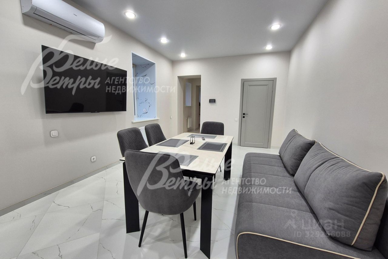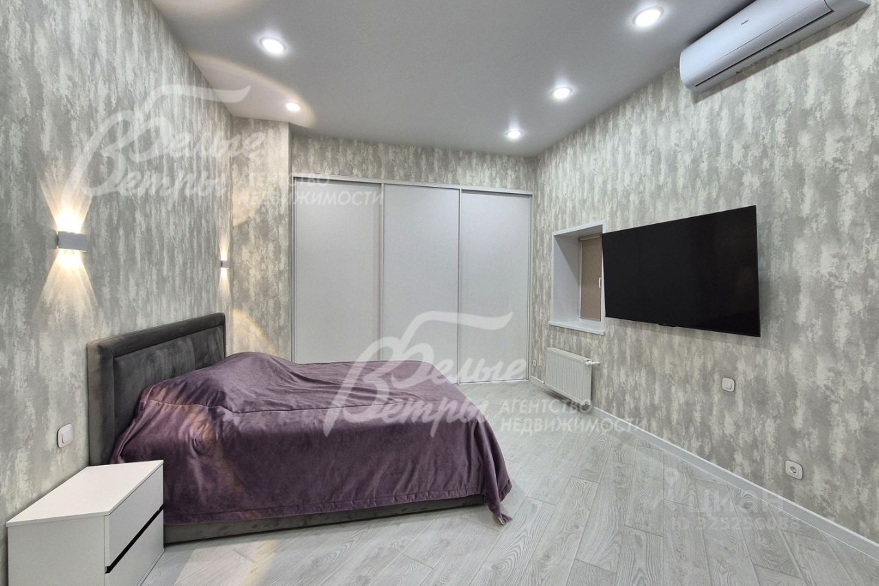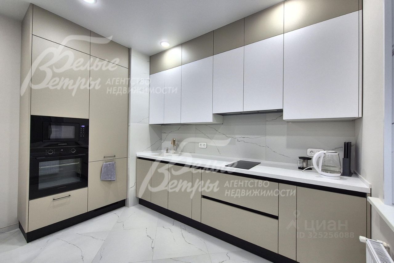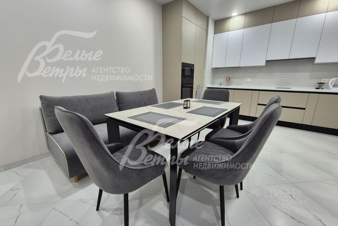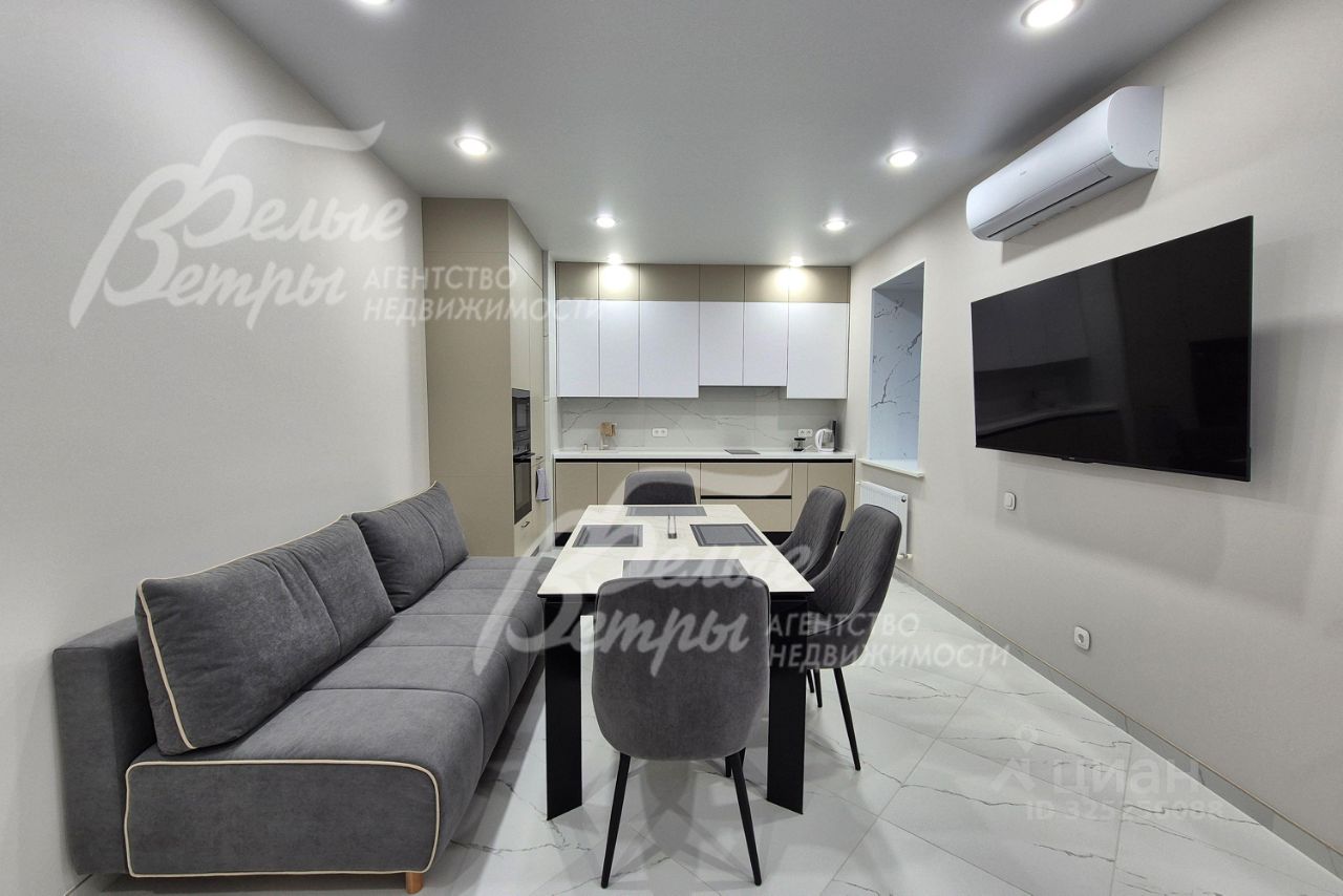 Мебель, оборудование: угловой кухонный гарнитур со встроенной техникой: электрическая варочная панель, духовой шкаф, микроволновая печь и холодильник Kuppersberg, посудомоечная машина (60см), двухкамерный холодильник. Стиральная машина на 7.5 кг, телевизоры 65 дюймов в гостиной и спальне. Обеденная группа на 6-8 персон, в гостиной диван, в комнате двуспальная кровать с тумбами, встроенные вместительные шкафы-купе, в т.ч. с зеркалами. Встроенные потолочные споты, стильные настенные бра..
