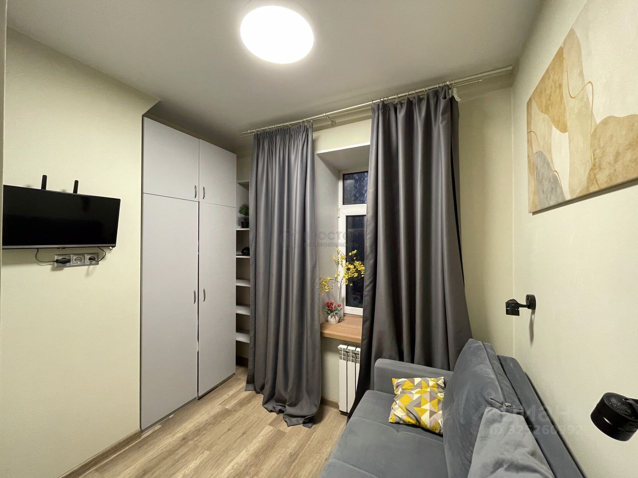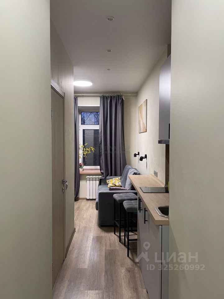 Студия с очень удачной планировкой. Дизайнерский ремонт выполнен качественными материалами. Укомплектована всей необходимой мебелью и техникой. Широкий тёплый подоконник может быть использован как место для отдыха.