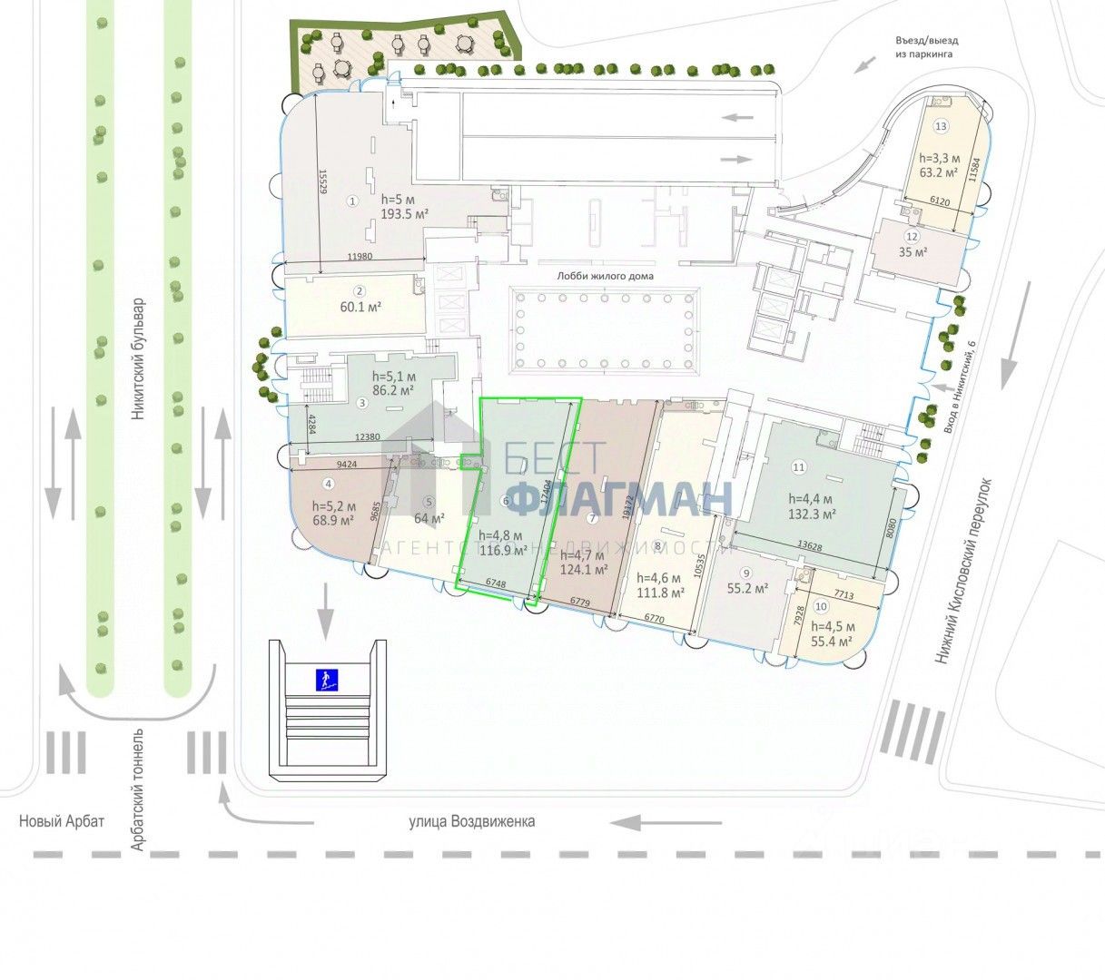 Арт. 128050516 В аренду предлагается торговое помещение в доме de luxe класса ''Никитский 6'', расположенном на пересечении улицы Воздвиженка и Никитского бульвара. Напротив находится станция метро ''Арбатская'', в пяти минутах ходьбы - Большая Никитская улица и район Патриарших прудов. Площадь помещения: 116,9 кв.м. Торговое помещение с отдельным вход с фасада, витринными окнами, свободной планировкой, с возможностью размещения вывески и с высокими потолками 4,8 метров, мокрая точка, электричества достаточно для любой деятельности. Активный пешеходный трафик, близкое расположение центров притяжения людей, станций метро и остановок общественного транспорта, офисных и торговых точек, учебных заведений, театров.