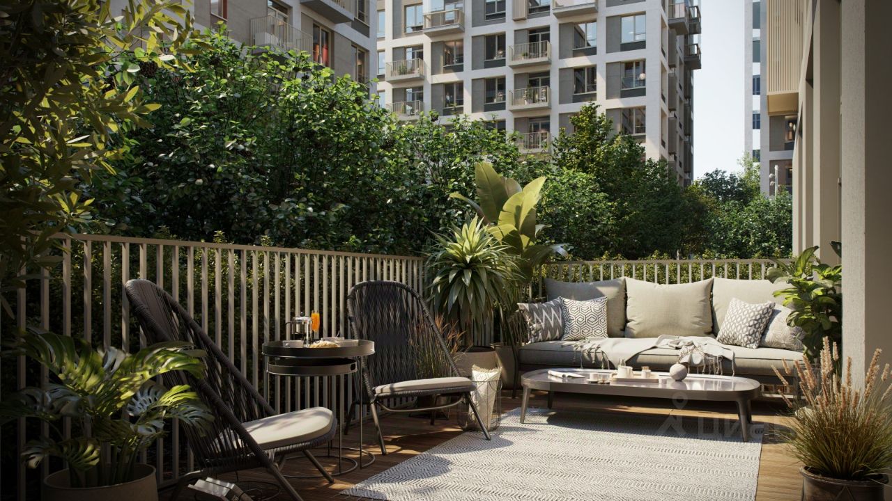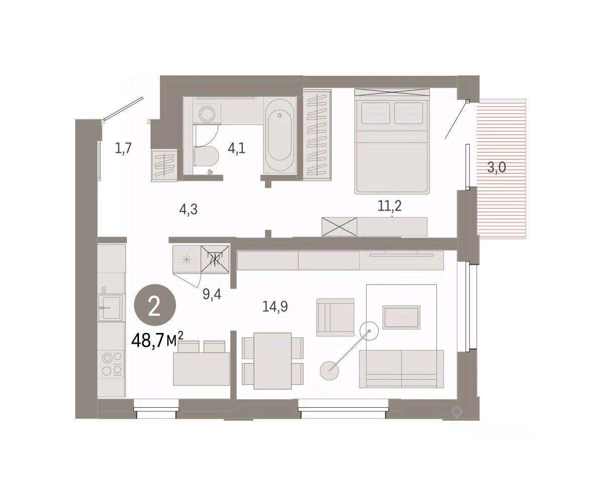 Квартира с кухней-гостиной и двумя спальнями в проекте Город-на-озере. Особенности планировки: балкон, предчистовая отделка, разнесённые спальни. квартиры в нашей базе: ГРД01-Ж5.4.2.