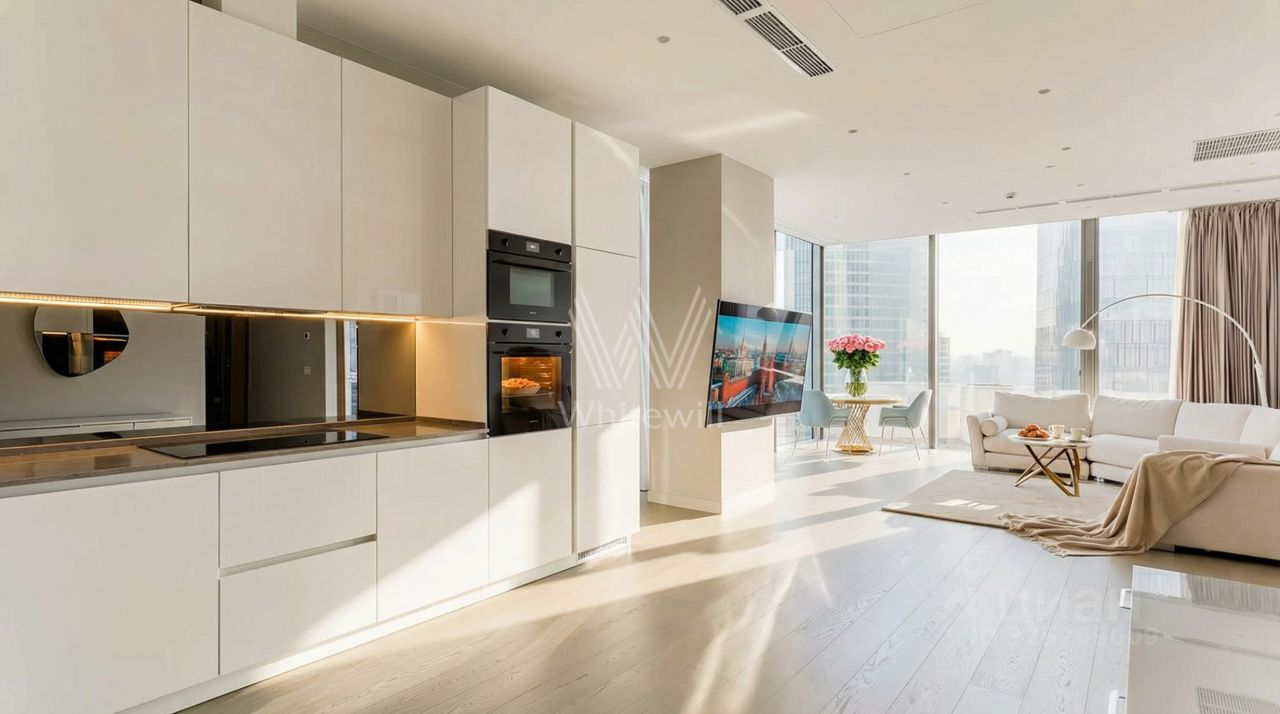 Видовые апартаменты с одной спальней общей площадью 88 м² в комплексе небоскрёбов премиум-класса Neva Towers. Апартаменты расположены на пятьдесят восьмом этаже, откуда открываются захватывающие виды на столицу. Выполнена отделка в светлом стиле, на полу паркетная доска, стены выровнены и окрашены. Вся техника производителя SMEG.