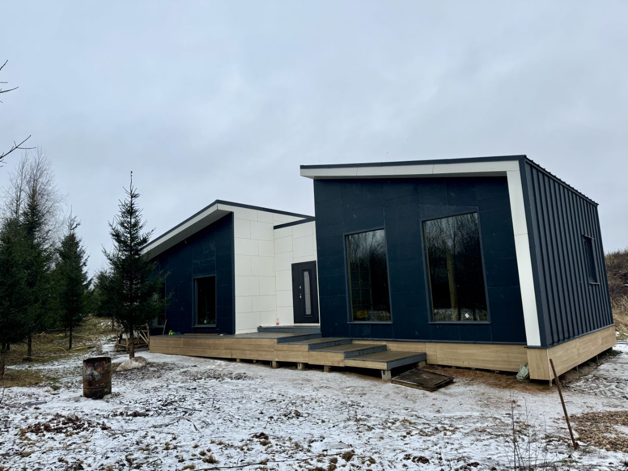 115 кв м без террасы 3 спальни , огромная кухня гостиная железобетонные сваи. фасад выполнен из фиброцементных панелей. кровля клик Фальц , от гранд Лайн окна панорамные , 3 м высокие потолки от 3 до 5 метров живописный участок с еловыми деревьями на территории. удобная геолакация документы готовы , быстрый выход на сделку.