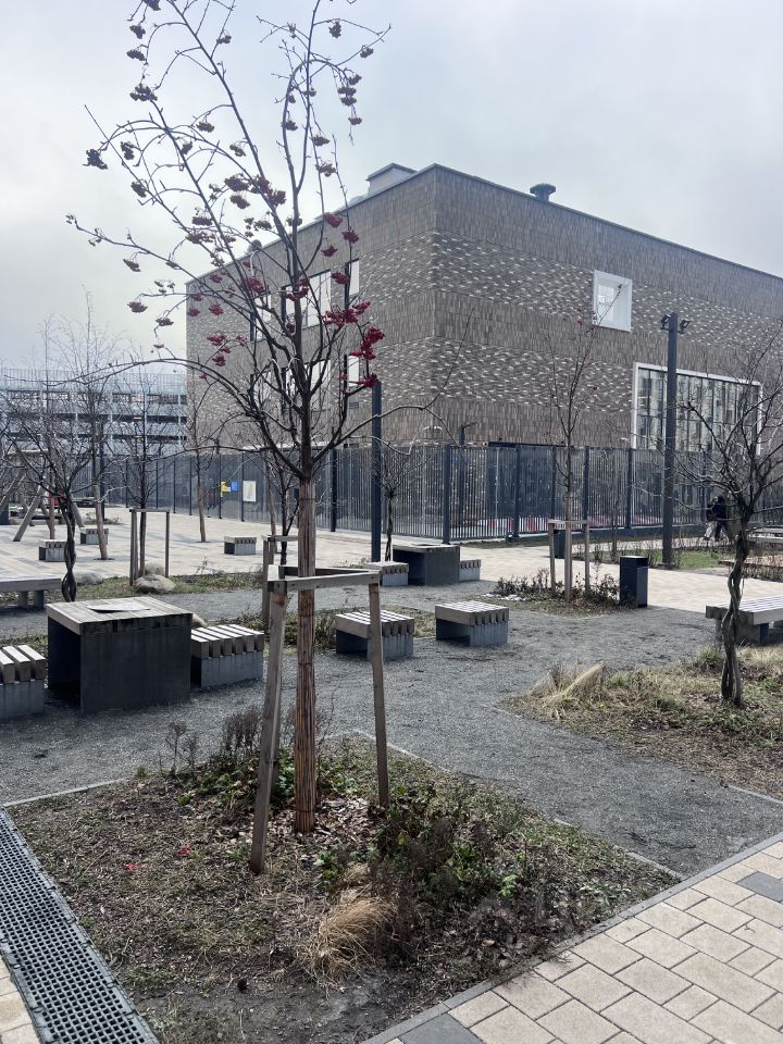 Рядом с домом есть крытый паркинг, дет. сад, школа. В самом доме расположены магазины: Пятерочка, Красное&Белое, Винлаб, пункты выдачи маркетплейсов Ozon и Wildberries, а также кофейня и аптеки. в соседнем доме - Вкусвилл. Через дорогу крупный ТЦ, включающий исчерпывающий список известных торговых сетей, в том числе АШАН и Леруа Мерлен.