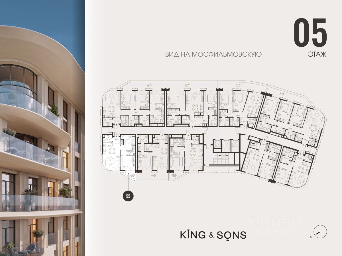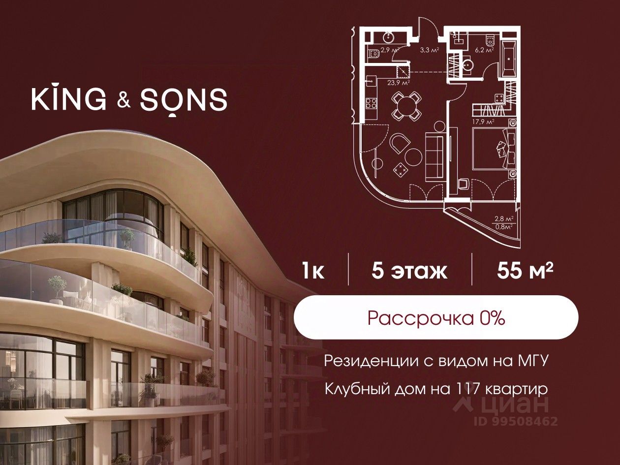 KING & SONS это клубный дом на 117 резиденций премиум-класса, расположенный на престижной и исторической улице Мосфильмовская. Из большинства квартир открываются панорамные виды на МГУ, ''Москву-Сити'', особняки посольств и парки. Это место для тех, кто не хочет выбирать между комфортом мегаполиса и уединением на природе.