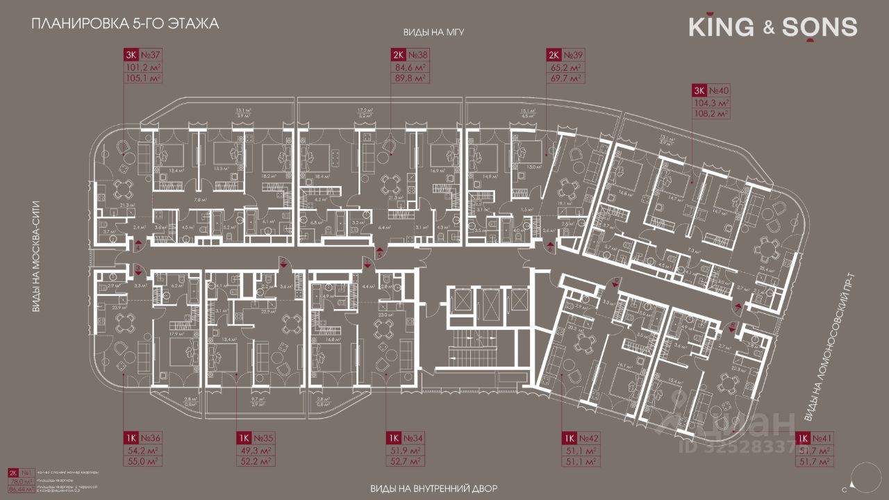 KING & SONS это клубный дом на 117 резиденций премиум-класса, расположенный на престижной и исторической улице Мосфильмовская. Из большинства квартир открываются панорамные виды на МГУ, ''Москву-Сити'', особняки посольств и парки. Это место для тех, кто не хочет выбирать между комфортом мегаполиса и уединением на природе.