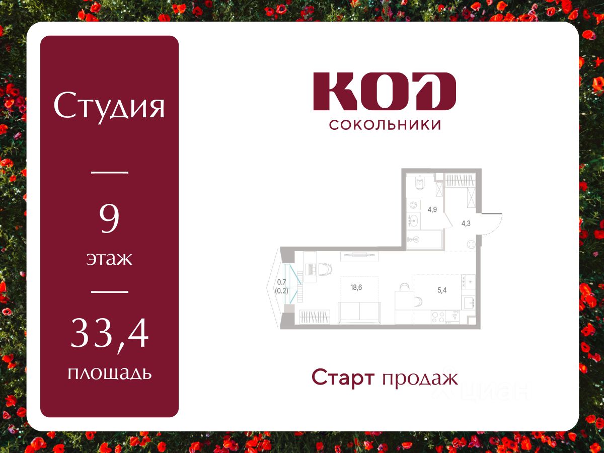 В семейном жилом квартале, расположенном в окружении более 500 га леса и объектов исторического наследия, продается квартира-студия площадью 33.40 кв. м без отделки. Квартира расположена на 9 этаже 12-этажного корпуса 2.1 жилого квартала бизнес-класса КОД Сокольники от девелопера Новая Эра.