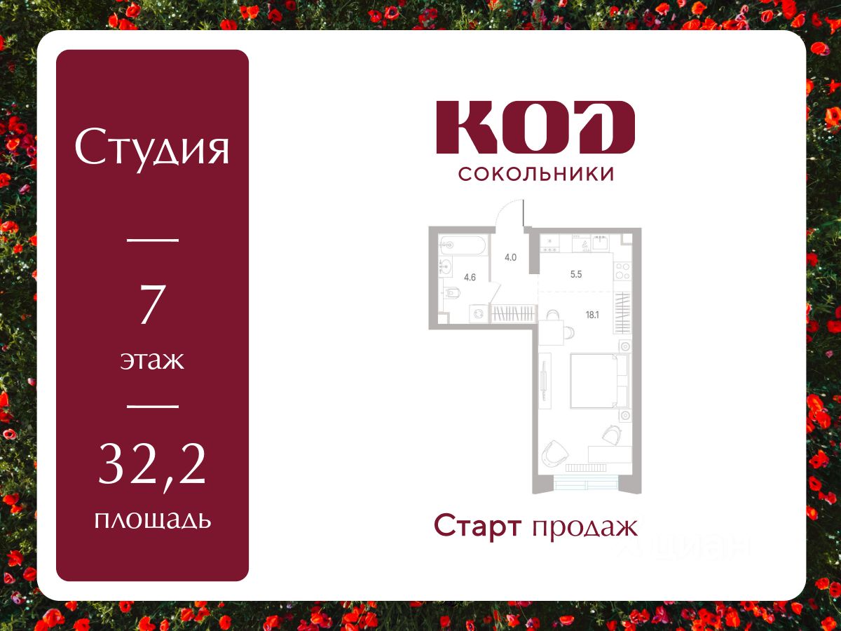В семейном жилом квартале, расположенном в окружении более 500 га леса и объектов исторического наследия, продается квартира-студия площадью 32.20 кв. м без отделки. Квартира расположена на 7 этаже 39-этажного корпуса 2.1 жилого квартала бизнес-класса КОД Сокольники от девелопера Новая Эра.