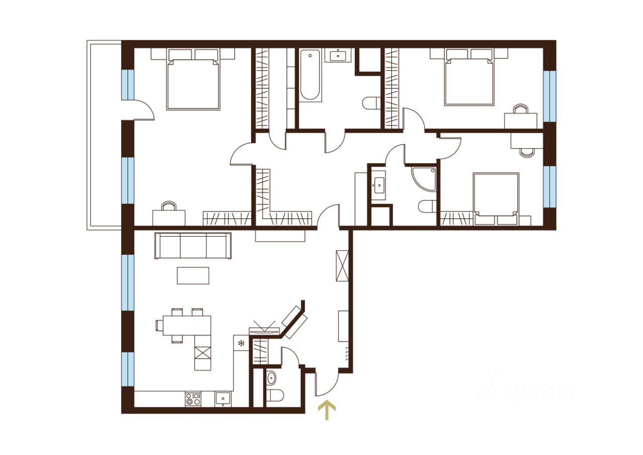 Пространство идеально разделено на общую и личную зоны. Центром притяжения станет просторная кухня-гостиная 40м² для атмосферных и теплых вечеров в кругу близких и друзей. Три изолированные спальни, образуют отдельное крыло: слева - хозяйская 31м² с выходом на балкон, справа - две детские 20м² и 14м². Такое зонирование гарантирует каждому члену семьи комфорт и уединение. По желанию можно организовать 4 комнату.