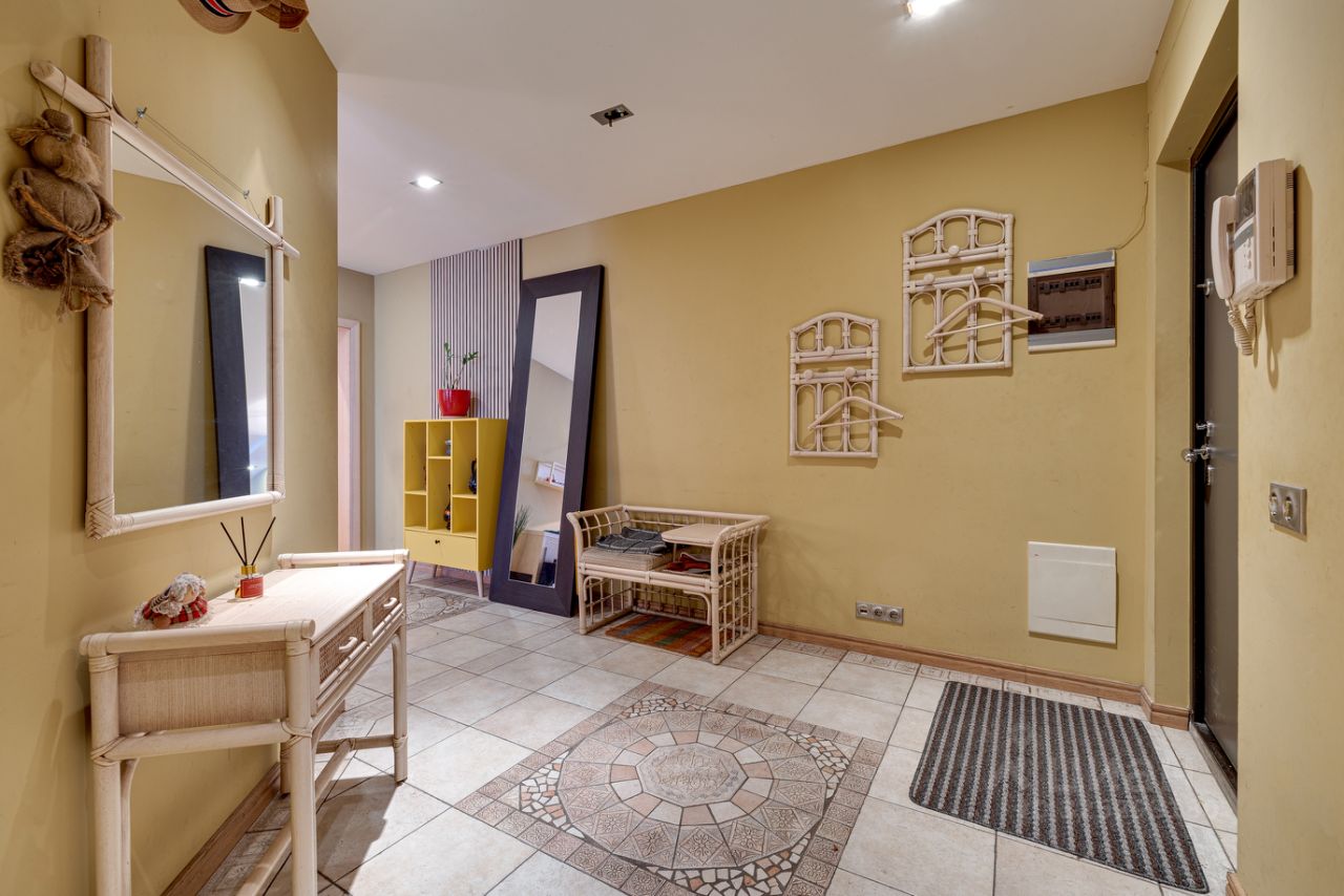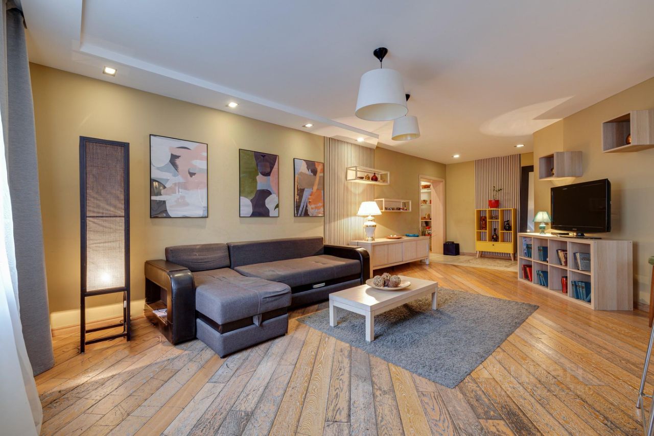 Стильный интерьер с преобладанием приглушенных и пастельных тонов. В качестве акцентов - изящные лампы с классическими текстильными абажурами и лаконичные живописные работы на стенах. 6 окон наполняют пространство естественным светом. Для поддержания комфортного микроклимата установлена система кондиционирования.