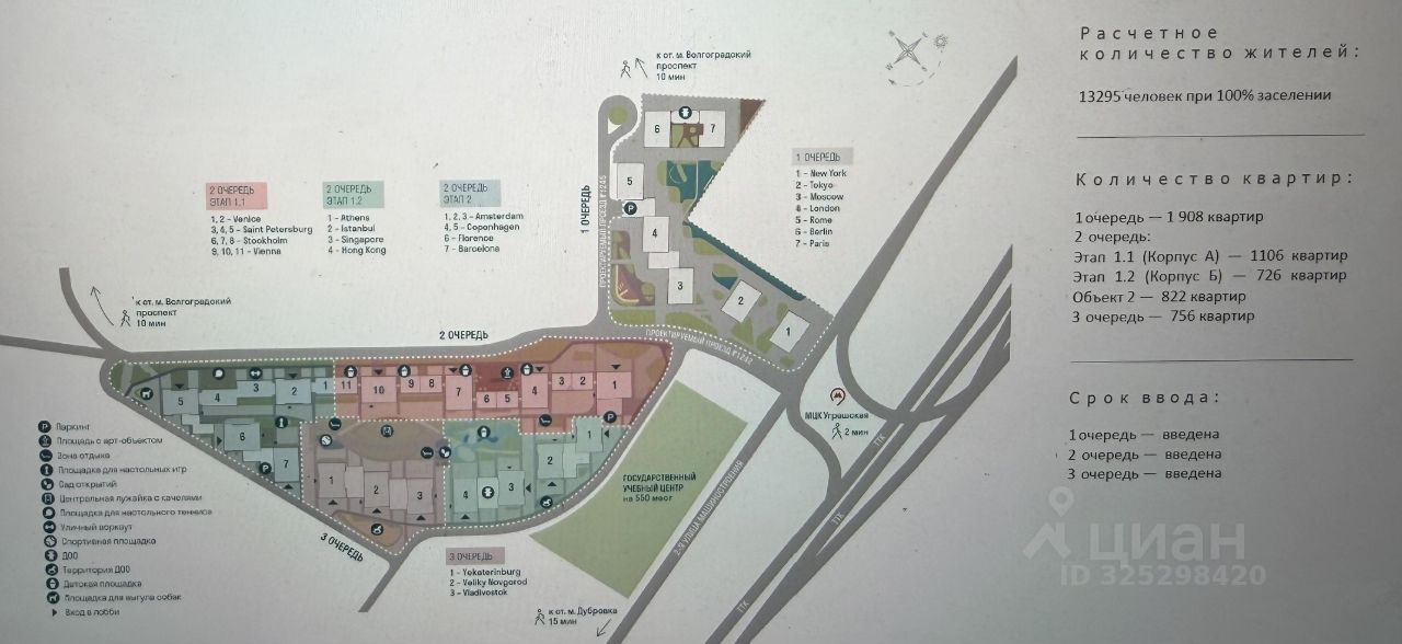 Комплекс состоит из трех очередей, суммарно более 5 300 квартир. Все очереди уже введены в эксплуатацию. Расчетное количество жителей — 13 295 человек. Это гарантирует высокий поток целевых клиентов. Инфраструктура вокруг ЖК слаборазвитая за счет большого количества не жилого фонда.