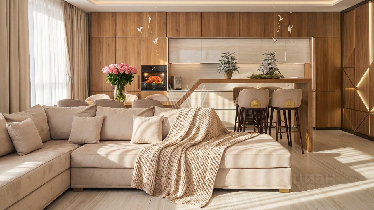 Квартира укомплектована премиальной мебелью и бытовой техникой Gaggenau, Liebherr, ASKO. Все деревянные элементы изготовлены из тика. Функциональная планировка включат кухню-гостиную с обеденной зоной, мастер-спальню с собственной гардеробной и санузлом, 2 детские спальни с санузлом, постирочную, гостевой санузел и холл. Благодаря панорамному остеклению пространство наполнено естественным светом и теплом.