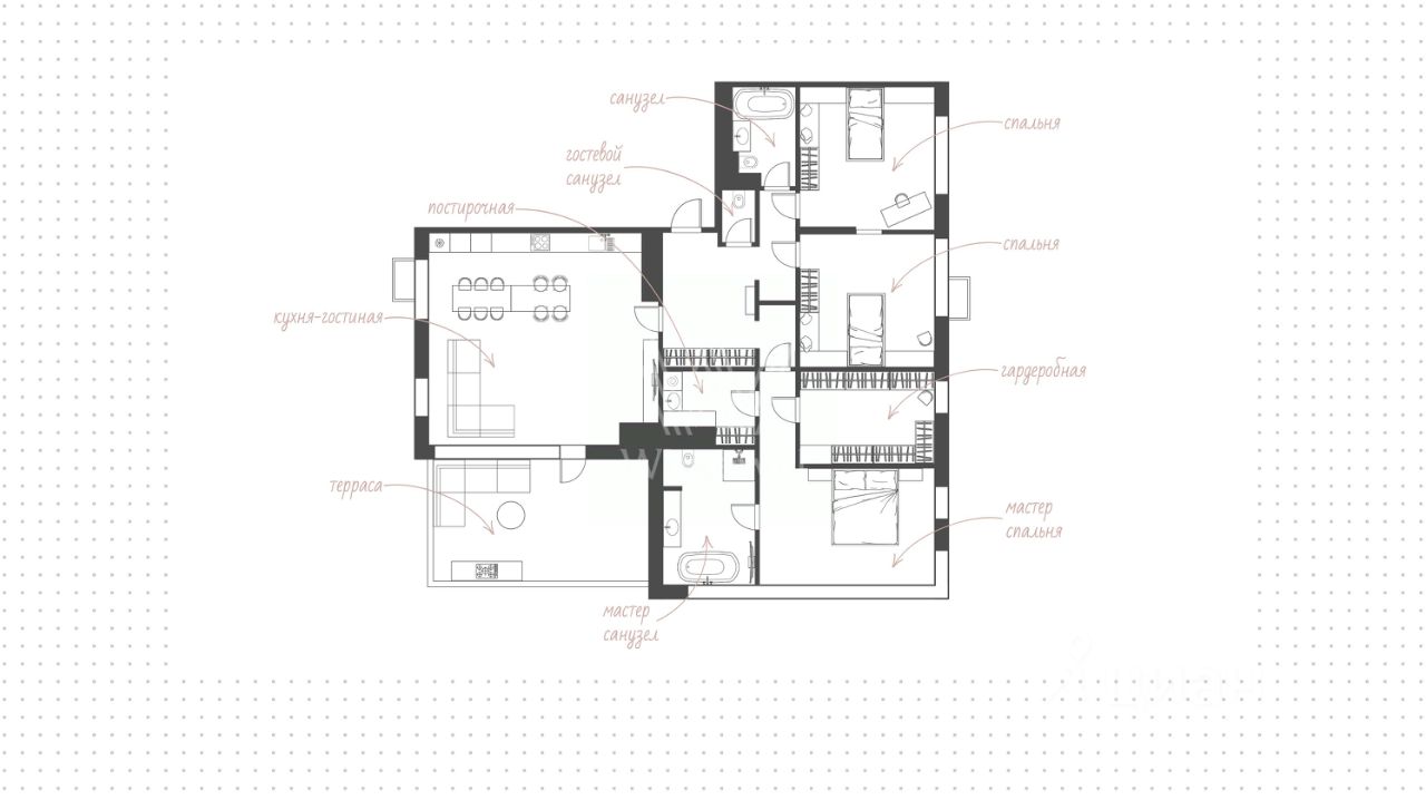 Квартира укомплектована премиальной мебелью и бытовой техникой Gaggenau, Liebherr, ASKO. Все деревянные элементы изготовлены из тика. Функциональная планировка включат кухню-гостиную с обеденной зоной, мастер-спальню с собственной гардеробной и санузлом, 2 детские спальни с санузлом, постирочную, гостевой санузел и холл.