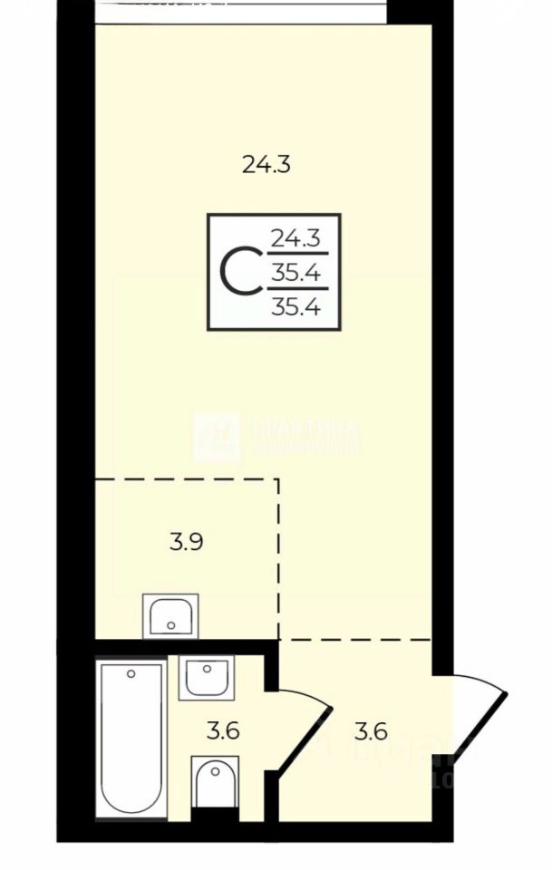 Общая площадь квартиры — 35,4 кв. м, жилая — 24,3 кв. м. Также есть кухня площадью 4 кв. м. В квартире один совмещённый санузел. Квартира без отделки, что даёт возможность новому владельцу воплотить свои дизайнерские идеи.