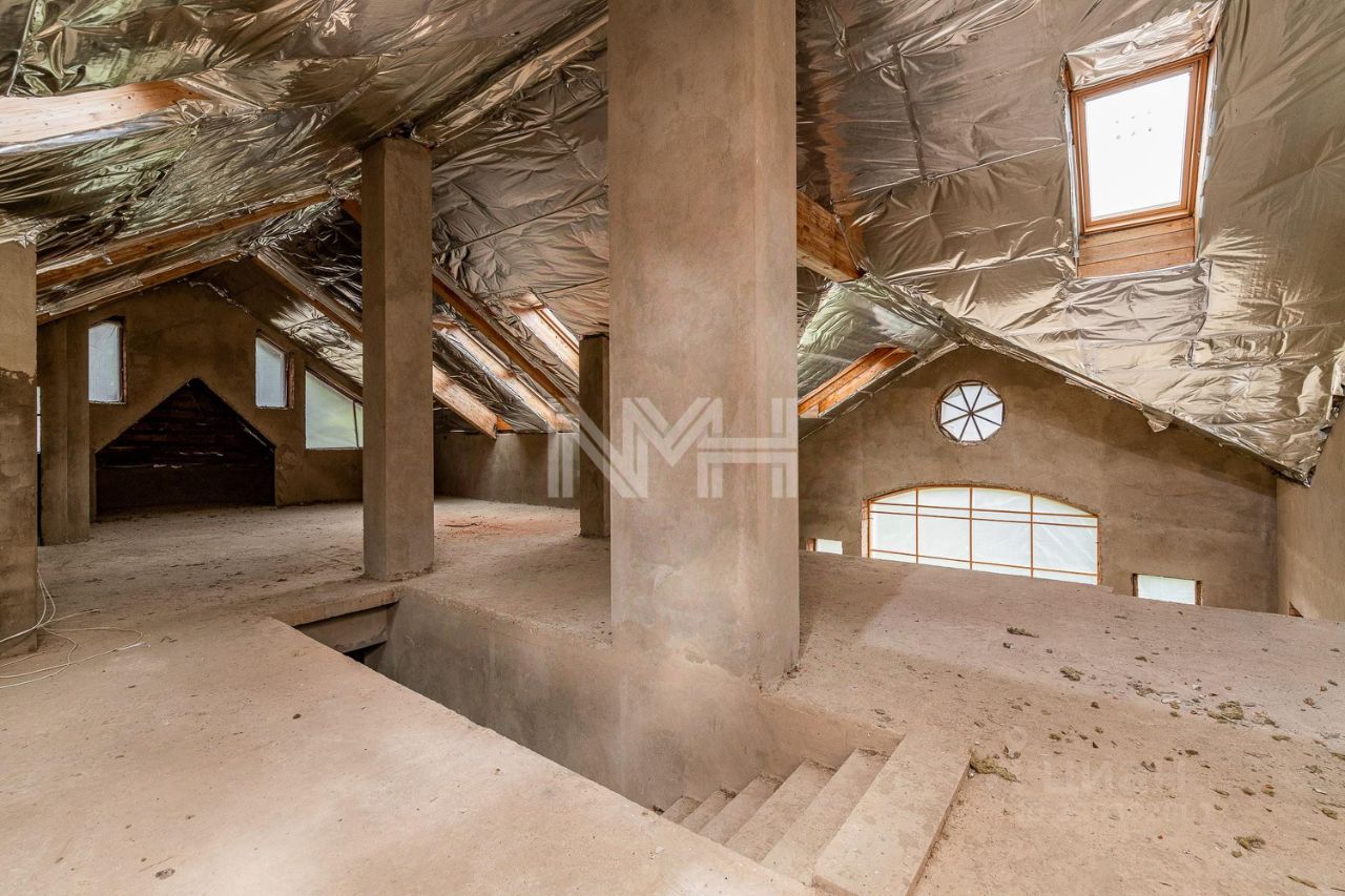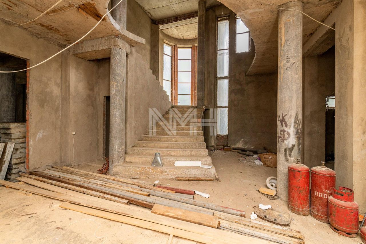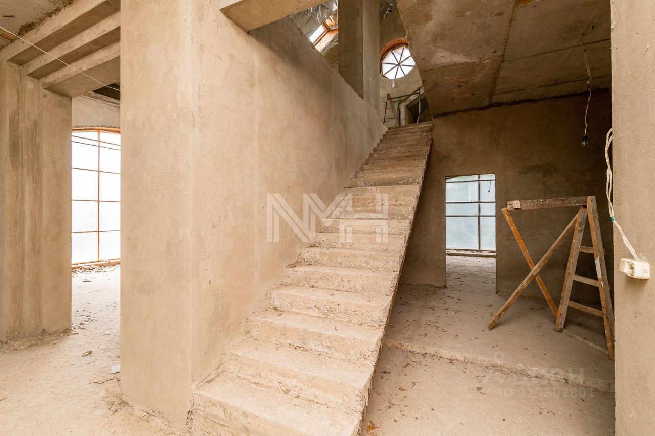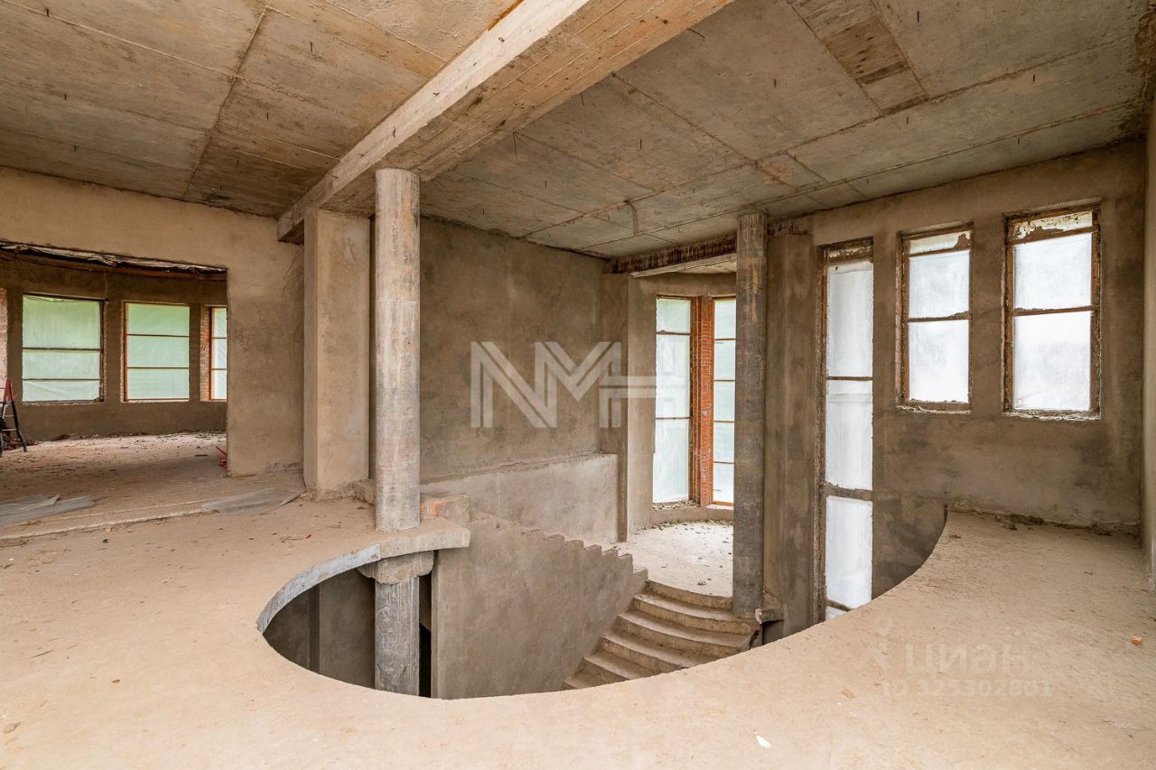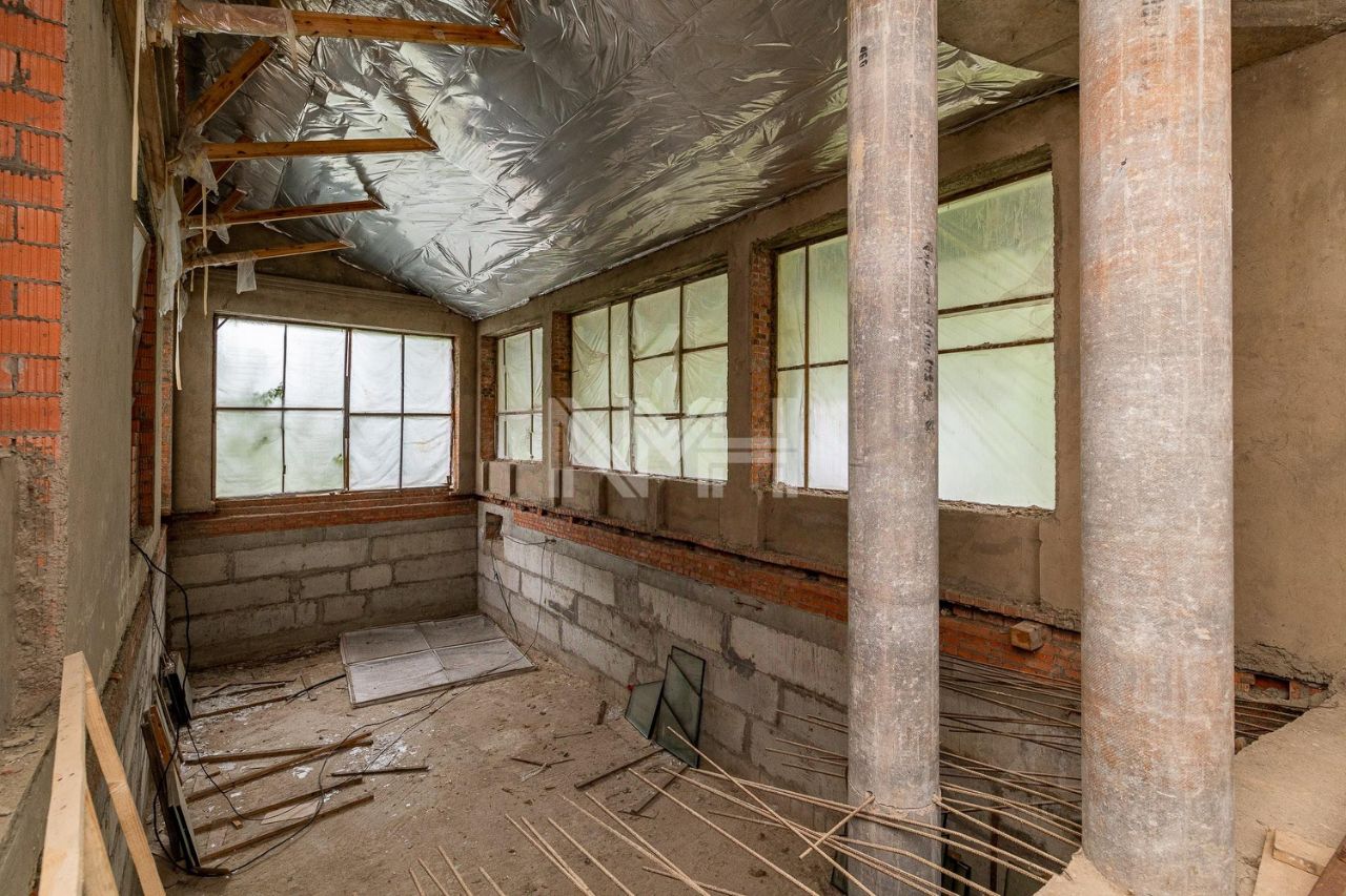 просторный дом без отделки, панорамные окна, большой бассейн и СПА-зона, свой выход в лес. Площадка под просторную террасу. Лесные деревья на участке. Общая площадь дома 1025 кв. м.