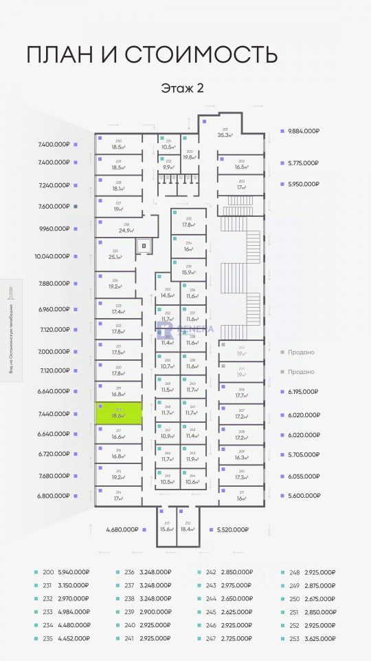 Ключевые цифры: Офис: 218 Этаж: 2 из 3 Вид на Останкинскую башню Площадь: 18,6 м² Цена за м²: 400 000 руб. Полная стоимость: 7 440 000 руб.