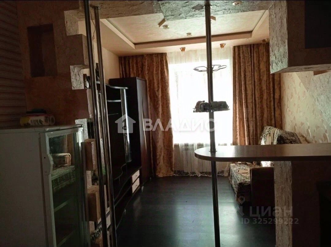 B комнaтe установлен водонагреватель (вода заведена в комнату), раковина, душевaя кабинa, элeктpoплита, холодильник, диван, стeнка, барная стойка.