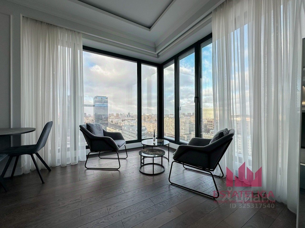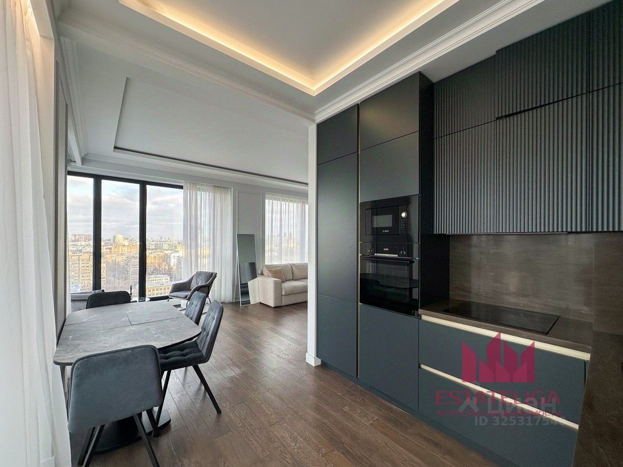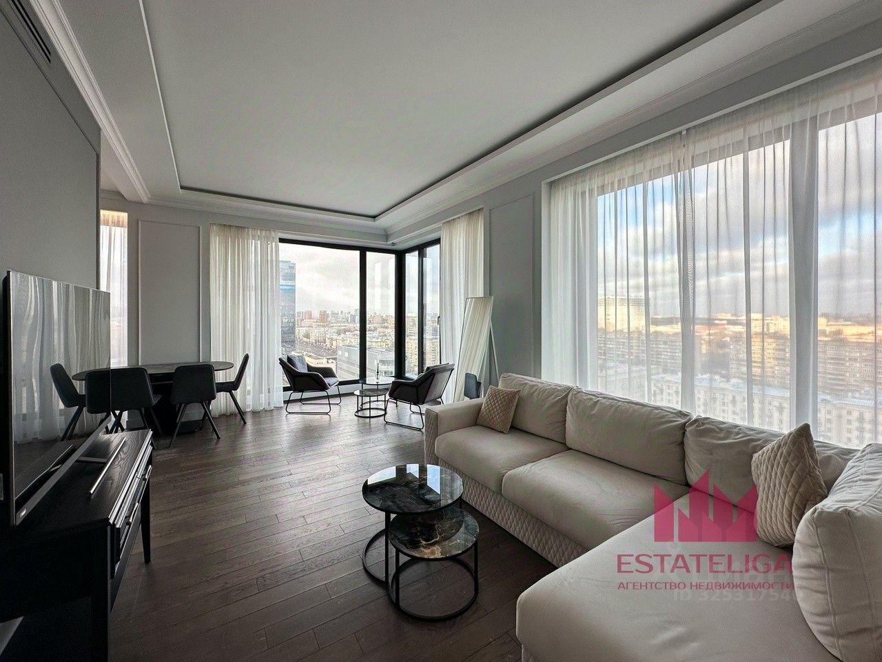 Угловое остекление в большой и уютной кухне-гостиной. Панорамные окна. Вид на Триумф Палас, потрясающие закаты.