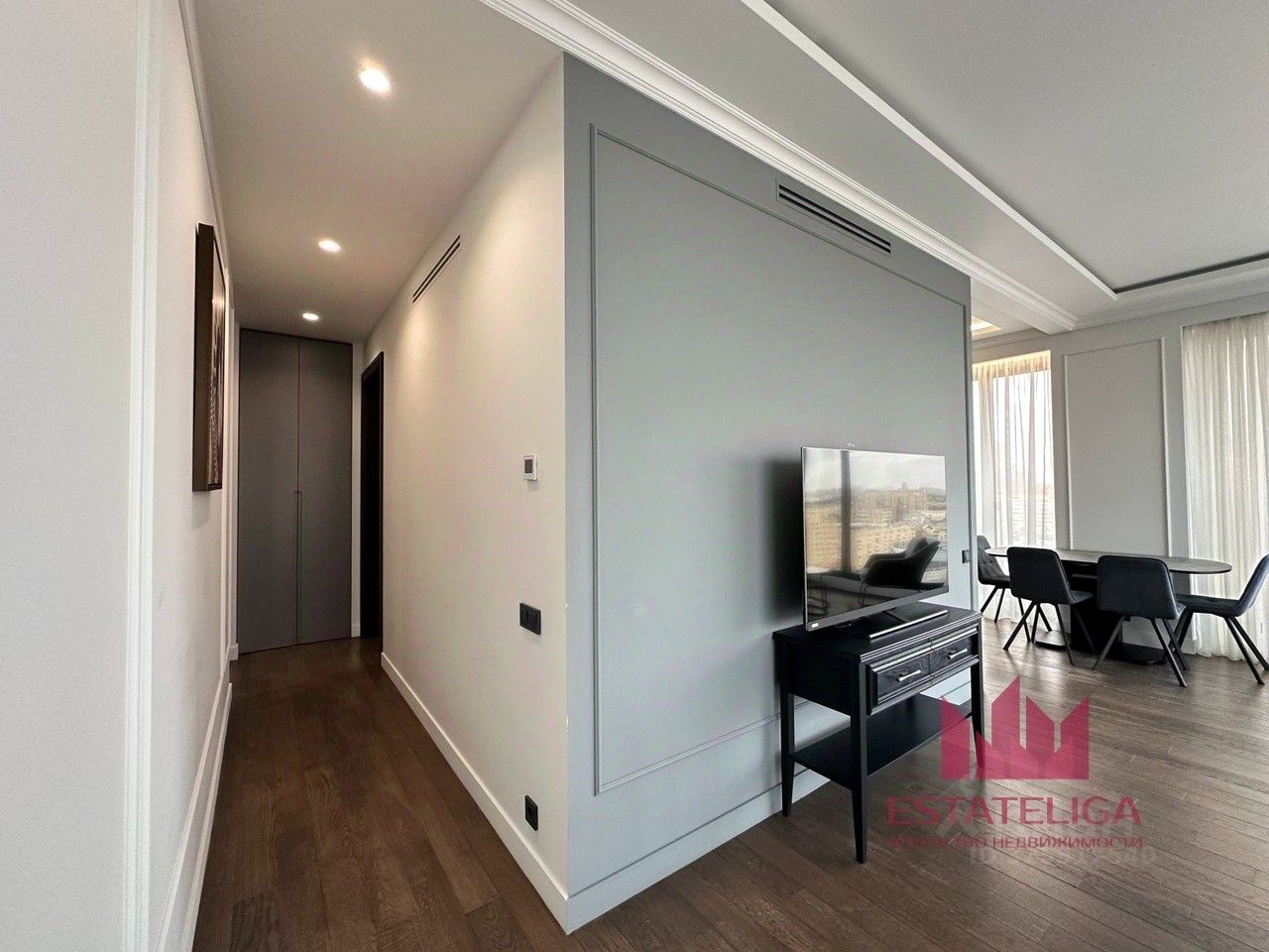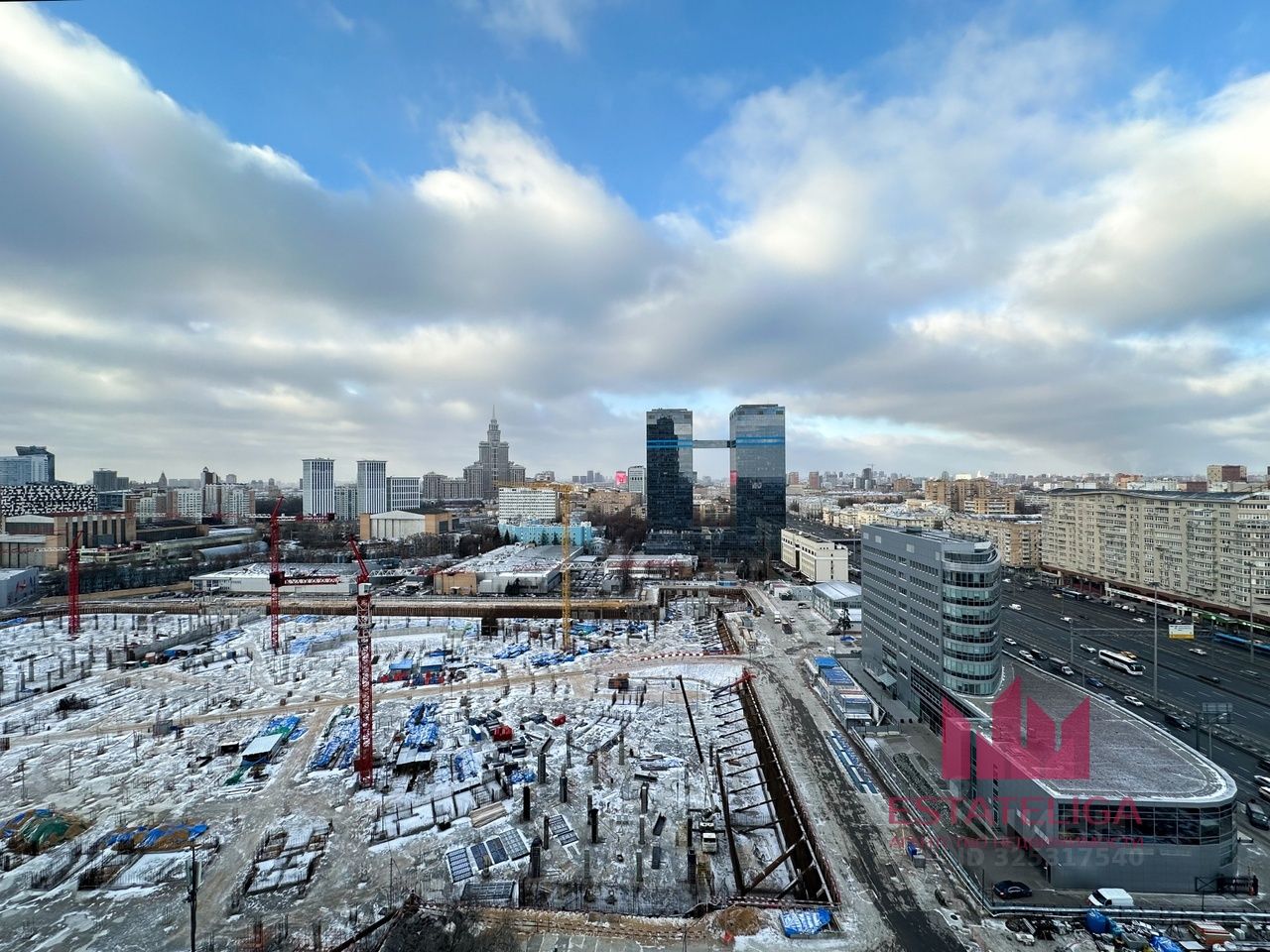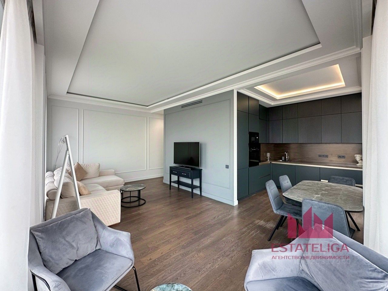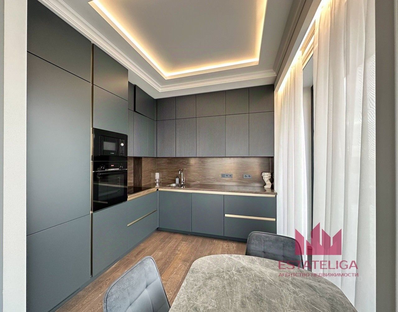 Угловое остекление в большой и уютной кухне-гостиной. Панорамные окна. Вид на Триумф Палас, потрясающие закаты.