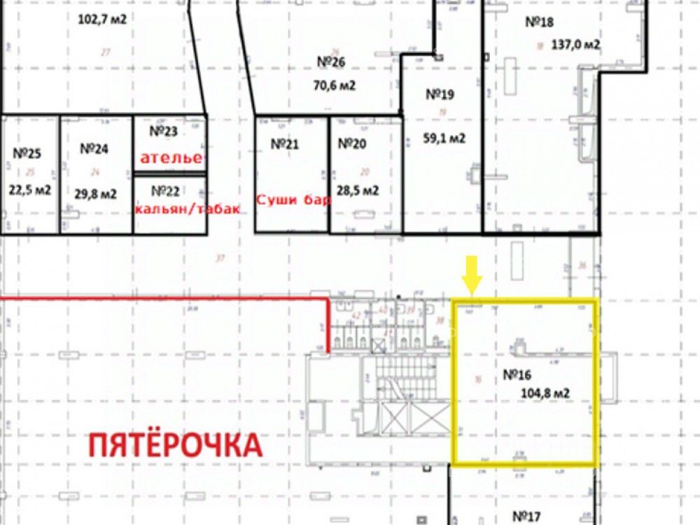 Технические условия: 1-ый этаж жилого 10-этажного дома. Общая площадь 104,8 м², Прикассовая зона супермаркета ''Пятёрочка''. Отдельный вход, витринное остекление, открытая планировка. Мощность электроэнергии 21 кВт. Высота потолков - 4 м.