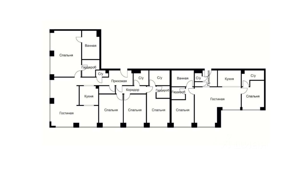 Возможно спланировать просторную кухню-гостиную, до шести спален, до пяти санузлов, гардеробные, постирочную, холл.