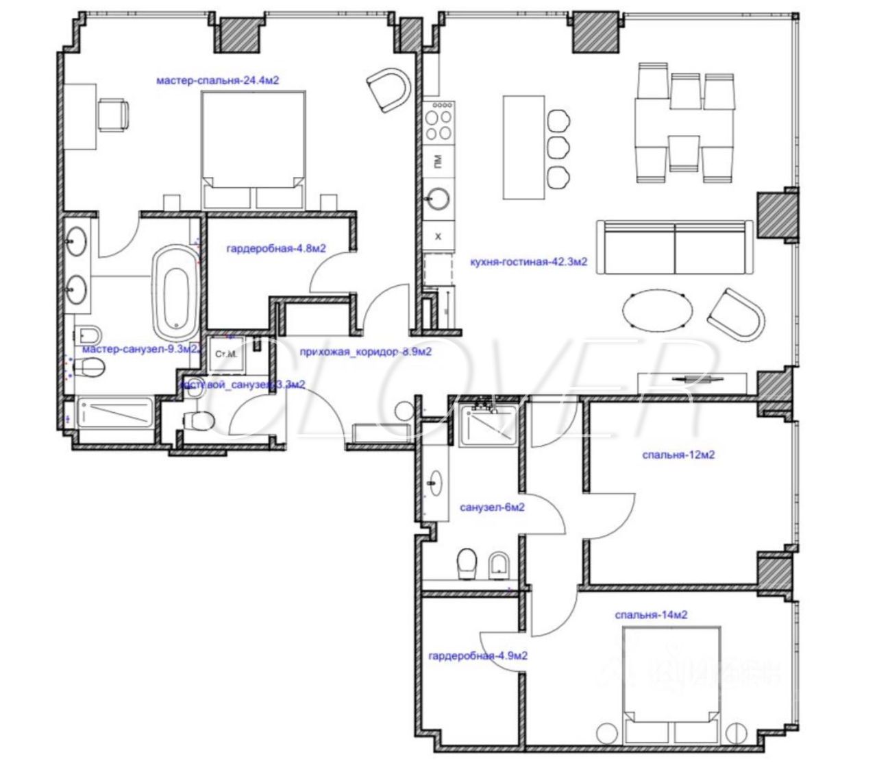 Спланирована кухня-гостиная, мастер-спальня с ванной комнатой и гардеробной, спальня с гардеробной, дополнительная спальня, два санузла, холл.