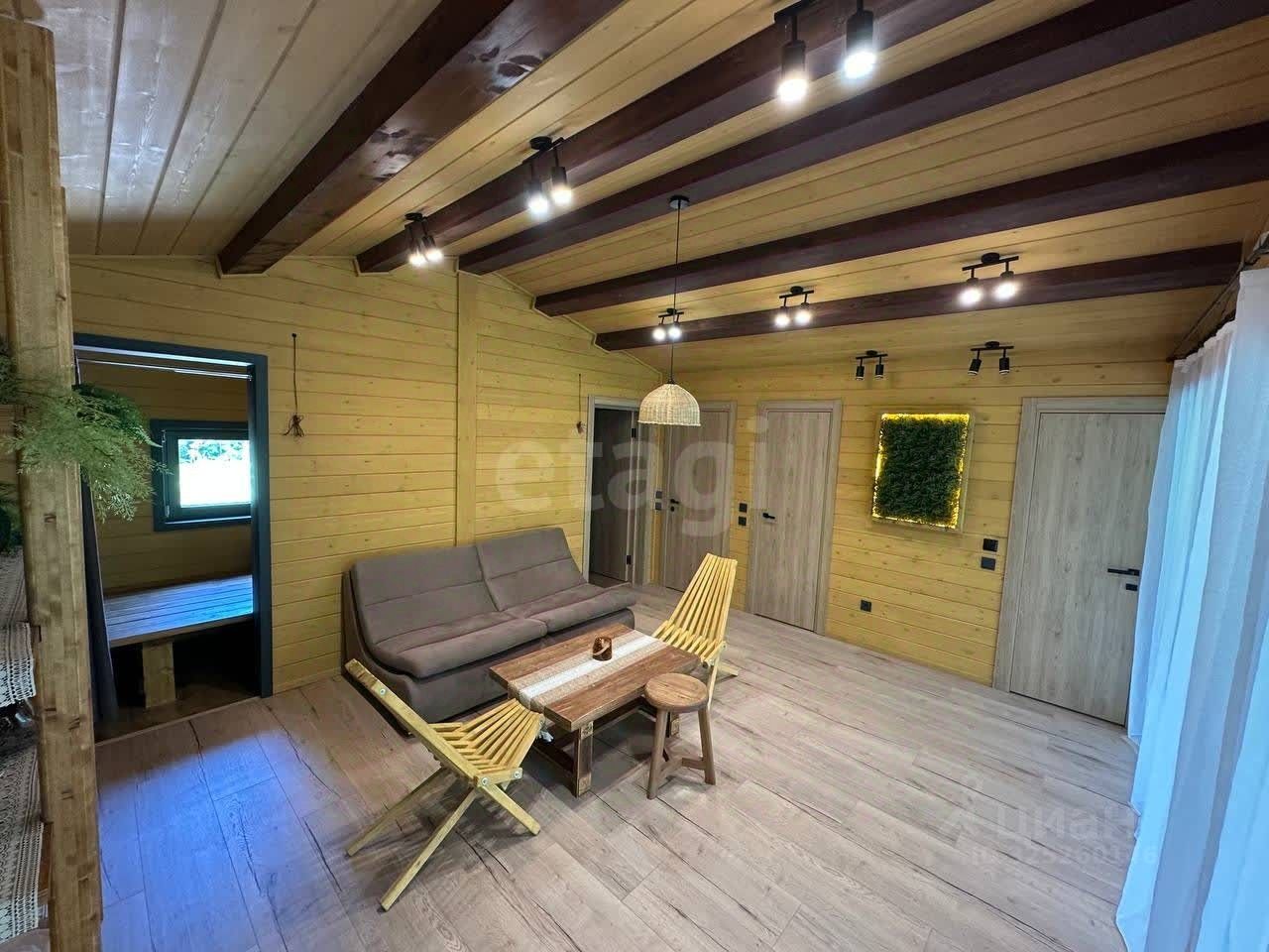 Планировка функциональна и включает просторную общую зону с раскладным диваном и панорамным остеклением, отдельную большую парную и две компактные комнаты, конфигурацию которых можно адаптировать под конкретные задачи. Кухонная зона в настоящее время не оборудована, что позволяет новому владельцу установить модуль по своему вкусу и бюджету.