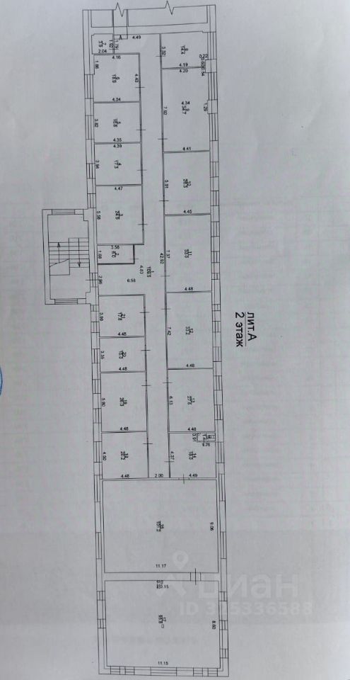 Помещение занимает весь второй этаж. Удобная планировка коридорного типа на две стороны, потолки 3м., два лестничных марша (основной и пожарный), центральное водоснабжение и отопление, электрическая мощность 380 кВт.