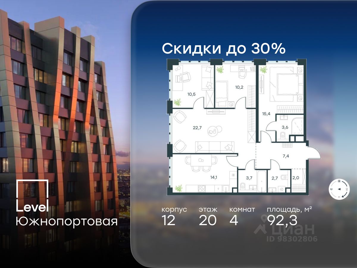 В северной части района Печатники продается 4-комнатная квартира площадью 92.30 кв.м без отделки. Квартира расположена на 20 этаже 20-этажного корпуса 12 в жилом комплексе комфорт-класса Level Южнопортовая (компания Level Group/Левел групп).