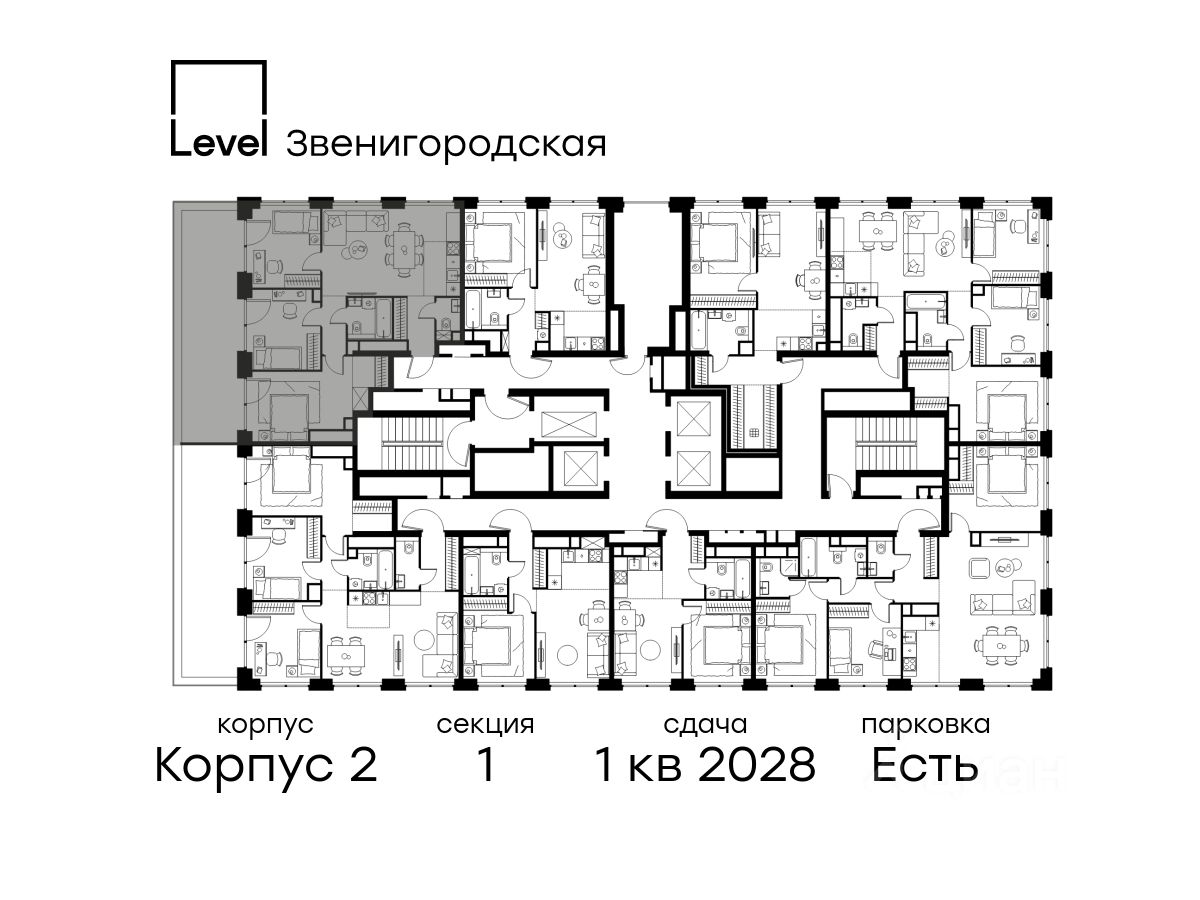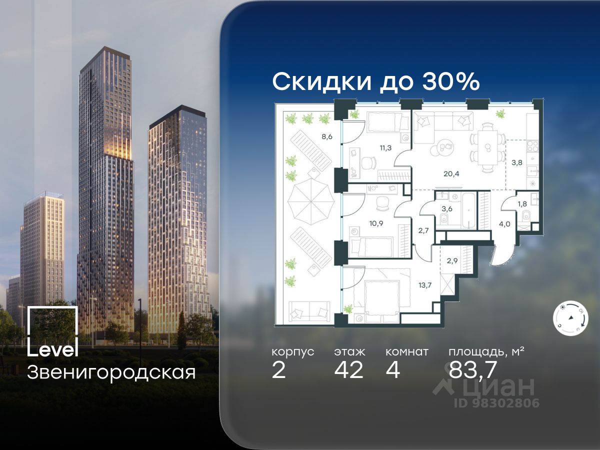В жилом квартале продаётся 4-комнатная квартира площадью 83.70 кв.м без отделки. Квартира расположена на 42 этаже 64 этажного корпуса 2 в жилом комплексе комфорт класса Level Звенигородская (компания Level Group/Левел групп).