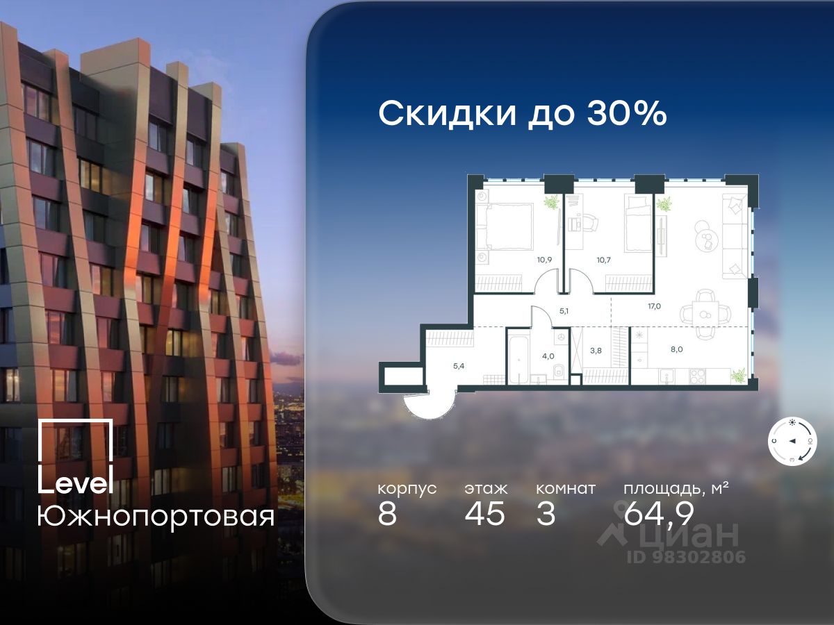 В северной части района Печатники продается 3-комнатная квартира площадью 64.90 кв.м без отделки. Квартира расположена на 45 этаже 49-этажного корпуса 8 в жилом комплексе комфорт-класса Level Южнопортовая (компания Level Group/Левел групп).