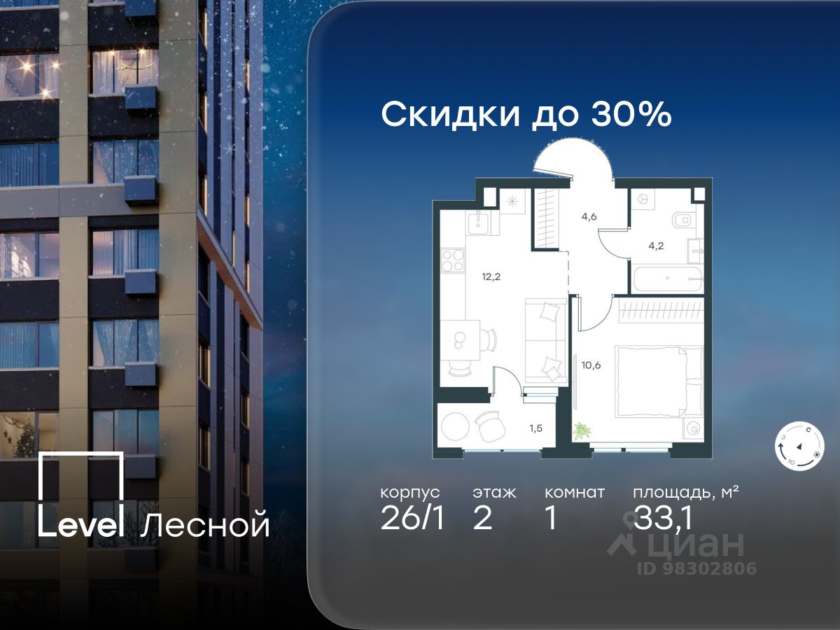 В районе, утопающем в густой зелени лесов, многочисленных парков и скверов, продаётся 1-комнатная квартира площадью 33.10 кв.м с отделкой white box. Квартира расположена на 2 этаже в жилом комплексе комфорт-класса Level Лесной (компания Level Group/Левел групп).