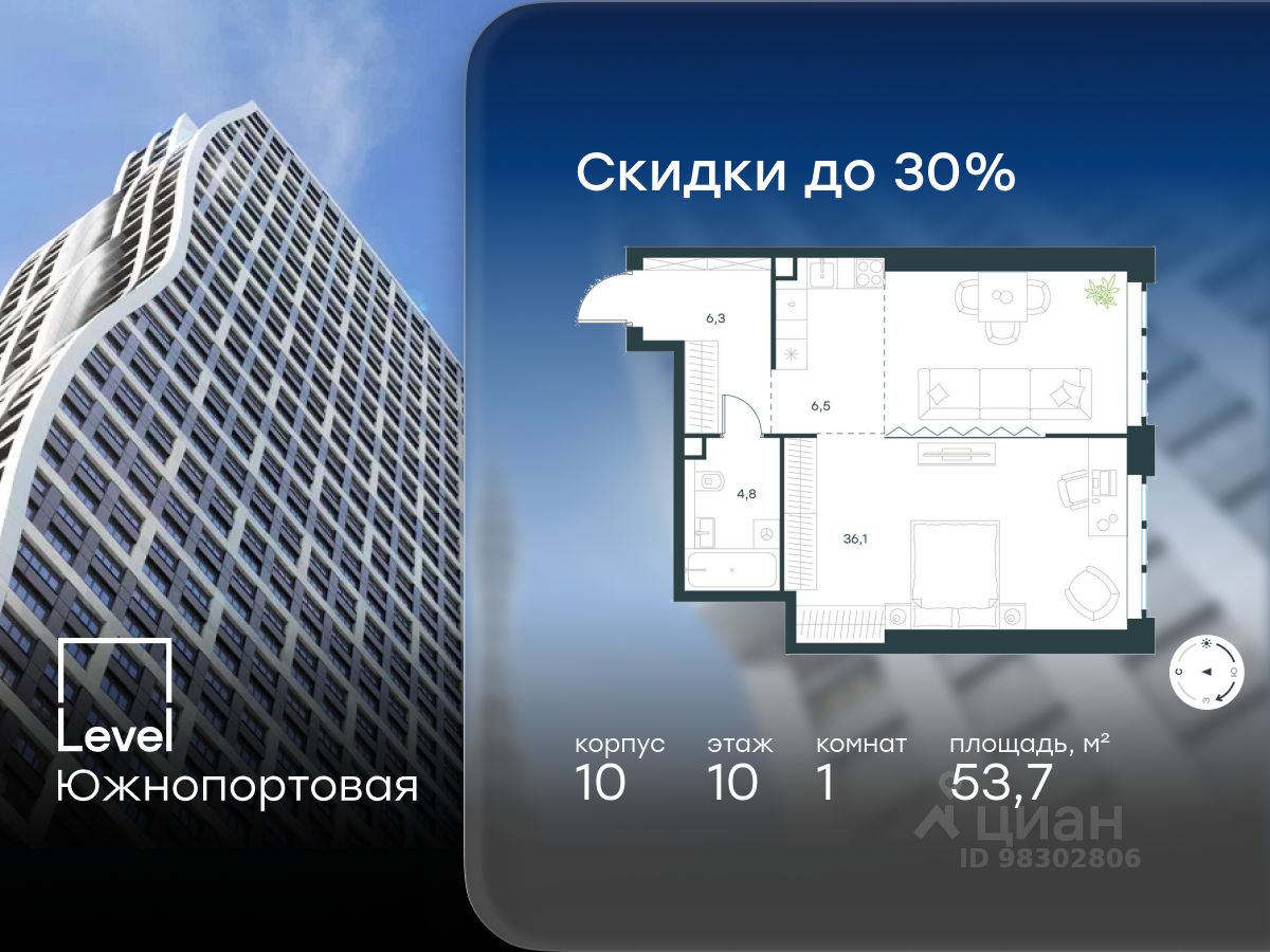 В северной части района Печатники продается 1-комнатная квартира площадью 53.70 кв.м без отделки. Квартира расположена на 10 этаже 68-этажного корпуса 10 в жилом комплексе комфорт-класса Level Южнопортовая (компания Level Group/Левел групп).