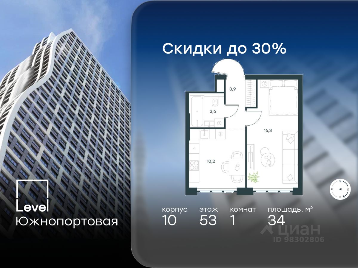 В северной части района Печатники продается 1-комнатная квартира площадью 34.00 кв.м без отделки. Квартира расположена на 53 этаже 68-этажного корпуса 10 в жилом комплексе комфорт-класса Level Южнопортовая (компания Level Group/Левел групп).
