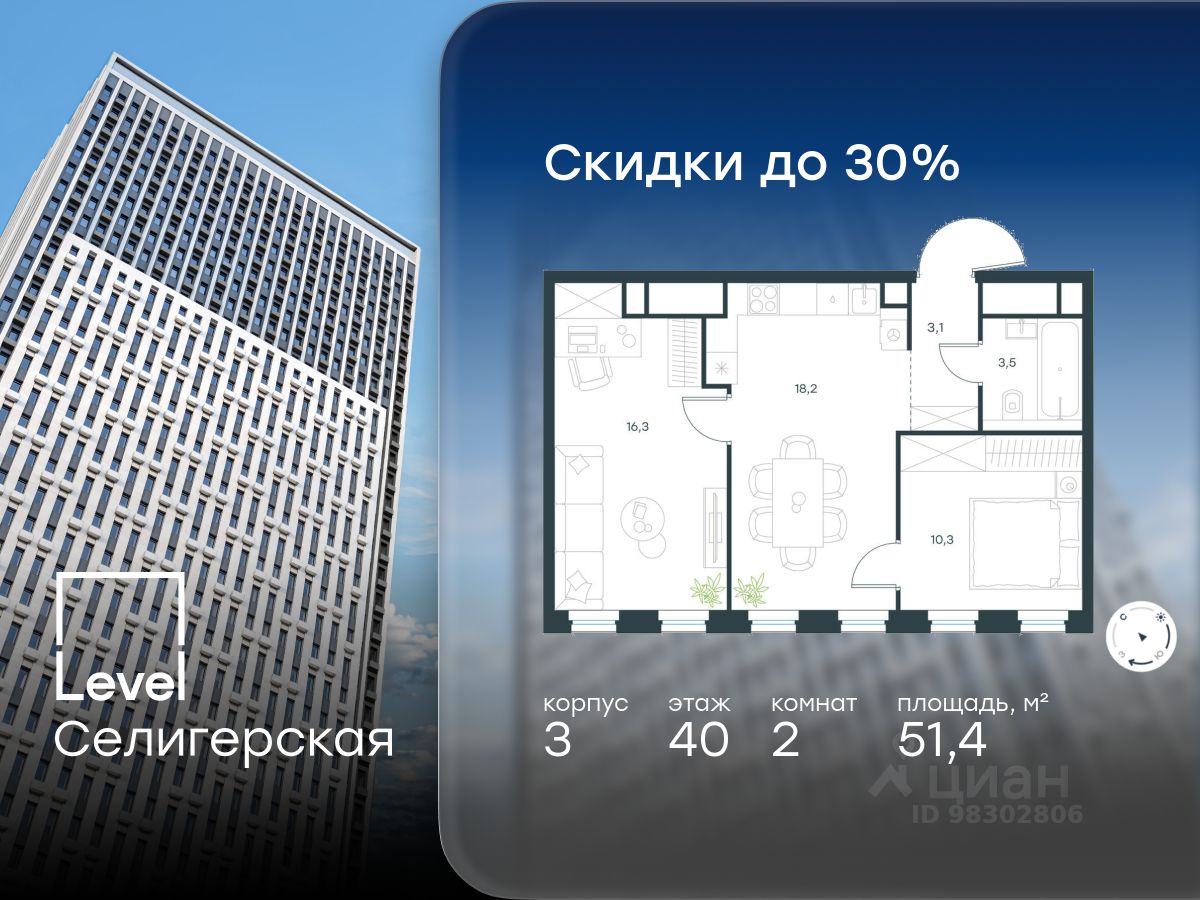 В жилом квартале, расположенном в южной части района Западное Дегунино, продаётся 2-комнатная квартира площадью 51.40 кв.м без отделки. Квартира расположена на 40 этаже 40-этажного корпуса 3 в жилом комплексе комфорт-класса Level Селигерская (компания Level Group/Левел групп).