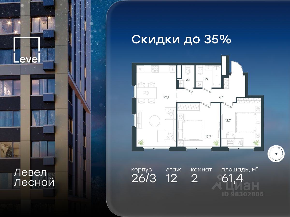В районе, утопающем в густой зелени лесов, многочисленных парков и скверов, продаётся 2-комнатная квартира площадью 61.40 кв.м без отделки. Квартира расположена на 12 этаже в жилом комплексе комфорт-класса Левел Лесной (компания Level Group/Левел групп).