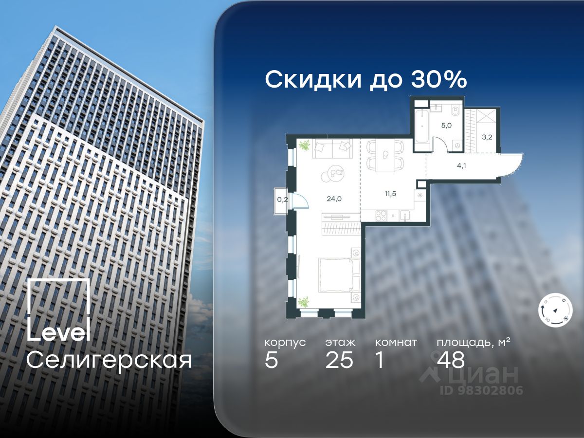 В жилом квартале, расположенном в южной части района Западное Дегунино, продаётся 1-комнатная квартира площадью 48.00 кв.м без отделки. Квартира расположена на 25 этаже 40-этажного корпуса 5 в жилом комплексе комфорт-класса Level Селигерская (компания Level Group/Левел групп).