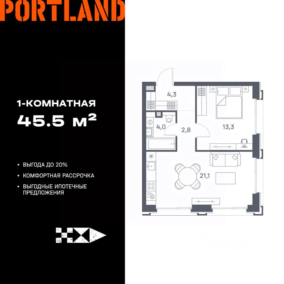 Продаётся 1-к. квартира, 20 этаж в жилом комплексе бизнес-класса Portland от девелопера FORMA. ЖК расположен на берегу Москвы-реки в северной части района Печатники в акватории Южного речного порта. Основные преимущества проекта: • Самая протяженная береговая линия реки в Москве 13 км. • Вид на реку в сторону запада панорамные окна на самое широкое водное пространство Москва-реки (900 м) и на закат. • 95% квартир с видом на воду. • К Portland не примыкает крупных автомагистралей - отсутствие фонового шума дорог. • В перспективе ближайших 11 лет на территории района запланировано грандиозное преобразование и комплексное развитие. • Собственная набережная длиной 412 м., которая после завершения строительства сомкнется с эко-парком Печатники. • Прямой выход к воде и отсутствие проезжей части между Portland и береговой линией. • Инфраструктурное разнообразие: супермаркеты, крупные торговые центры, рестораны, кафе, фитнес-клубы, бьюти-салоны, компании сферы услуг и многое другое. • Собственная школа на 300 мест и детский сад на 275 мест. • Паркинг на 650 м/м • Транспортная вседоступность: метро, авто, велосипед, речной трамвай, канатная дорога • 15 мин. пешком до м. Печатники, 15 мин. на авто до ТТК, 20 минут на авто до Садового кольца
