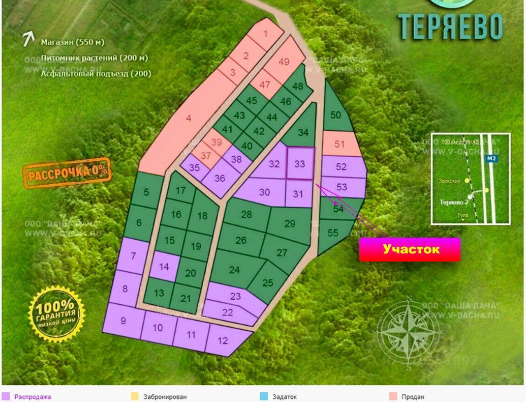 В округе есть все необходимое для комфортной жизни. В 800 метрах - продуктовый магазин. В 16 км в поселке Заокский - банки, почта, торговые центры, больница, школа, детские сады, полиция, железнодорожная станция.