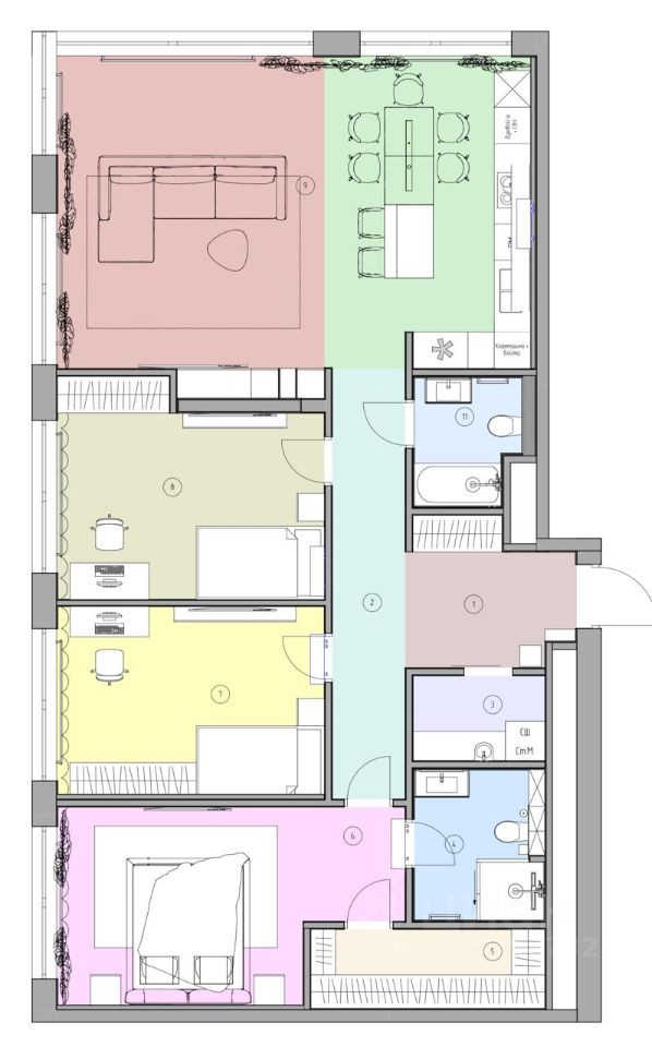 Кухня гостиная с панорамными окнами на воду, 3 изолированные спальни, 2 с/у, оборудованная постирочная, гардеробная комната.