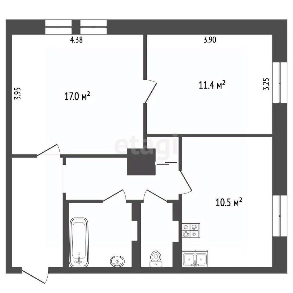 О КОМНАТАХ И КВАРТИРЕ Площадь продаваемых комнат: 17.0 + 11.4 = 28.4 м². Общая площадь квартиры: 96.9 м². В эту площадь входят также 26.1 м² мест общего пользования (коридор, кухня, санузлы), которые делятся между всеми соседями. Планировка: Комнаты смежно-изолированные. Это значит, что они находятся рядом и между ними есть дверь, но при этом каждая изолирована от общего коридора. Дверь между комнатами можно открыть, объединив пространство, или закрыть, получив две отдельные комнаты. Ремонт: В продаваемых комнатах сделан ремонт. Места общего пользования (кухня, санузлы, коридор) — без ремонта. Кухня: Площадь 10.5 м² — это общая кухня для всей коммунальной квартиры. Окна: Вид во двор, на окнах решетки. Этаж: 1-й (высокий) из 8 этажей. Потолки: Высокие — 3 метра, что характерно для сталинских домов.