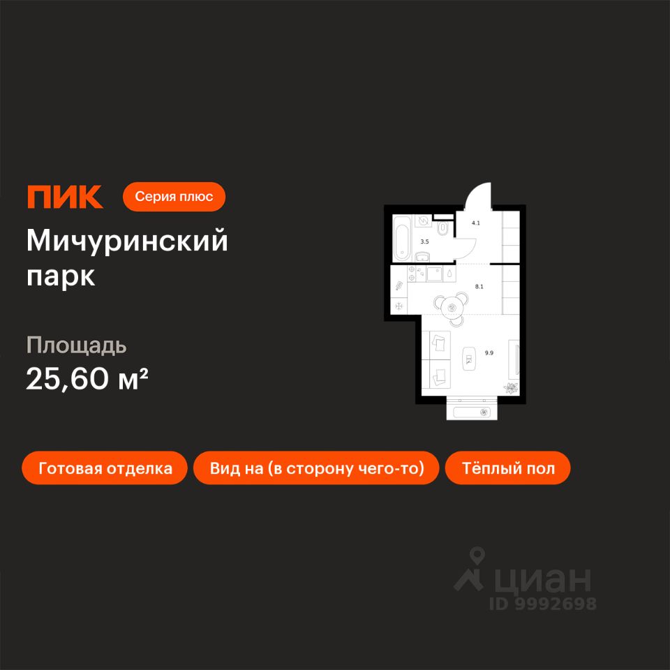 Продаётся квартира-студия площадью 25,6 кв.м на 23 этаже 32 этажного дома (Корпус 4.1, Секция 1) проекта ПИК Мичуринский парк. Светлый просторный подъезд на уровне земли, функциональная планировка, большие окна, c отделкой.