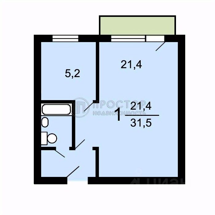 Общая площадь составляет 31,8 кв. м, из которых 21,4 кв. м — жилая площадь.